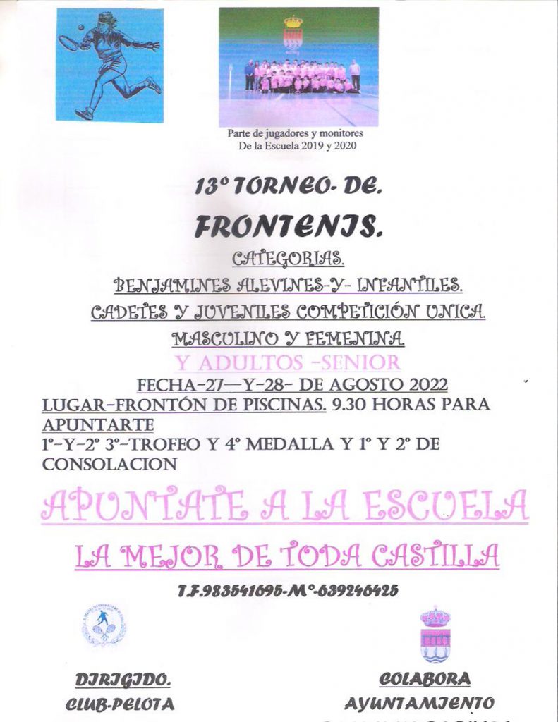 - Los encuentros se desarrollarán durante el sábado 27 de agosto (entrega de trofeos) y el domingo 28 de agosto en el Frontón de la Piscina Municipal.