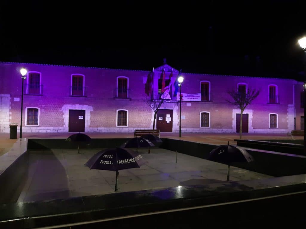 El Ayuntamiento de Laguna de Duero ha organizado diferentes actos simbólicos con motivo del 8 M, iluminación de la fachada del consistorio,pancartas en el Casa de las Artes y Ayuntamiento,colocación de paraguas de color morado en la Plaza Mayor y decoración del Cento Civico el Cascajo.