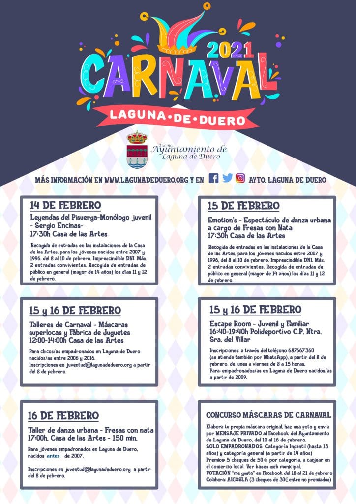 - Concurso Online de Máscaras:podrán participar todos los vecinos y vecinas empadronados en Laguna de Duero, a partir del 10 de febrero.Un concurso con más de 500€ a repartir en las diferentes categorías,infantil y adulto.