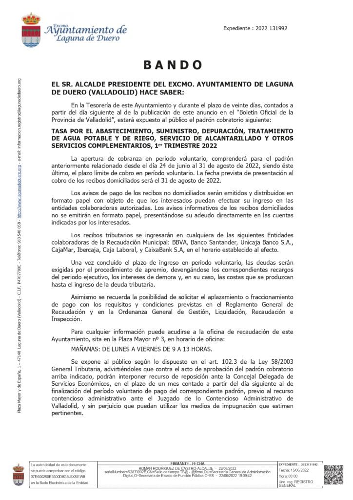 Tasa por el abastecimiento, suministro, depuración, tratamiento de agua potable y de riego, servicios de alcantarillado y otros servicios complementarios 1er Trimestre 2022.