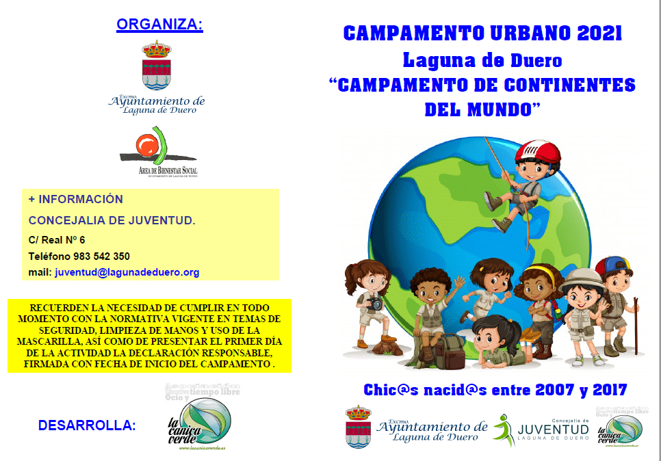 El Ayuntamiento de Laguna de Duero, a través de su Concejalía de Juventud, organiza el campamento urbano en la Casa de las Artes, desde el 24 de junio, hasta el 13 de agosto, de lunes a viernes, en horario de mañana, en la Casa de las Artes, Avenida Juan de Austria 3 ,destinado a participantes, preferentemente empadronad@s en Laguna de Duero y nacid@s entre los años 2007 y 2017,