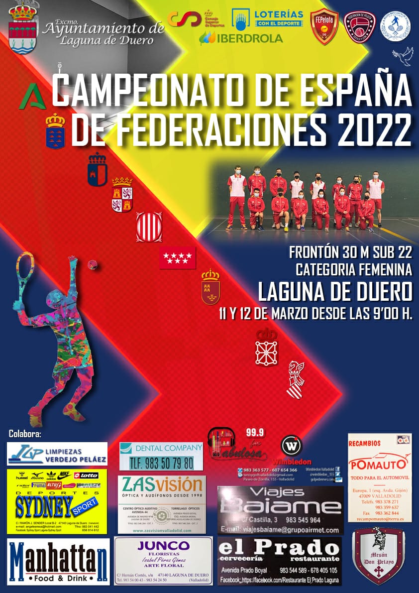 El Frontón municipal de Laguna de Duero acoge el Campeonato de España de Frontenis de 30 M SUB 22 Categoría Femenina. El Ayuntamiento de Laguna de Duero colabora con el Club Pelota Laguna y Federación Española de Pelota, en la celebración de éste Torneo que tendrá lugar este fin de semana.