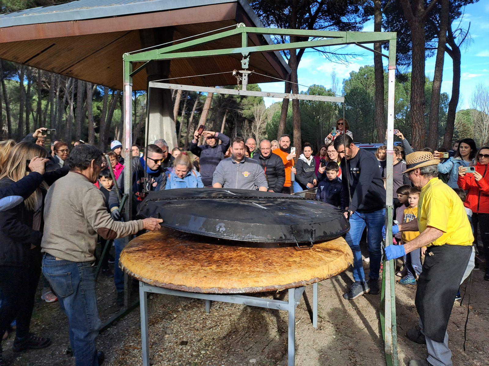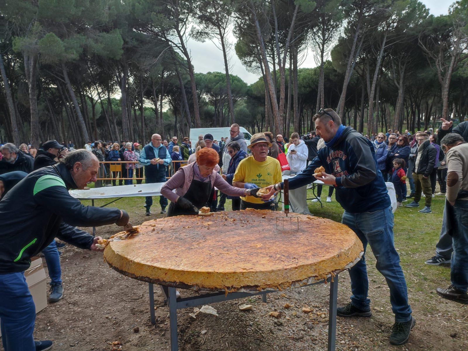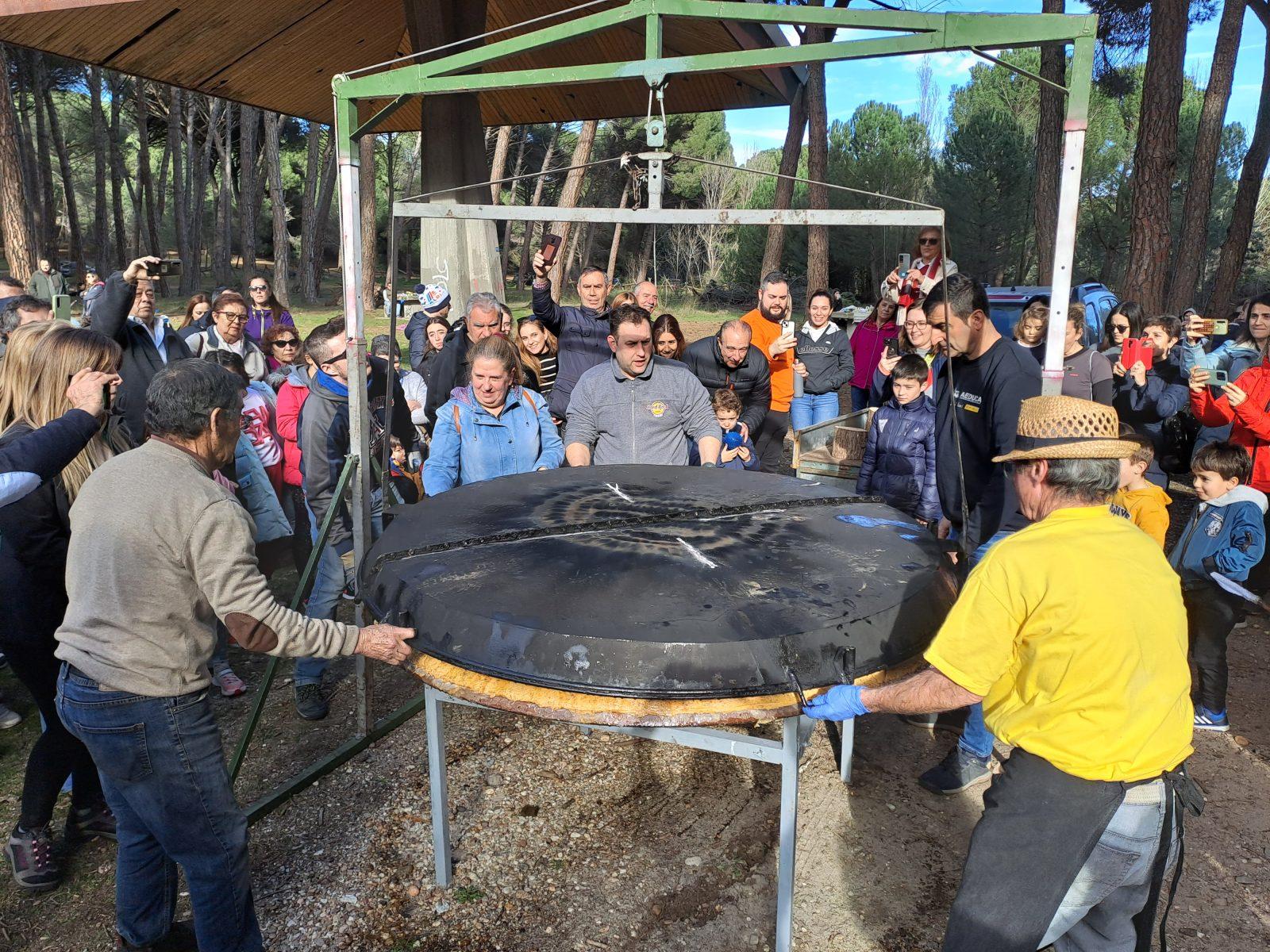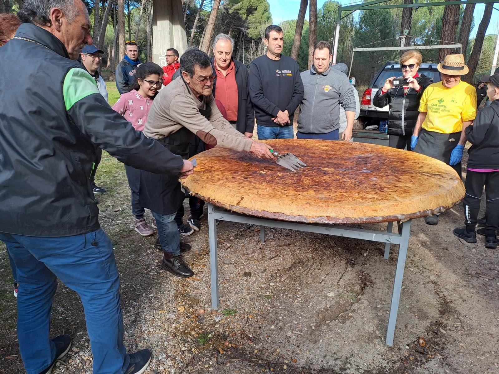 Tras este momento llegaba el más esperado de la tarde, el ver cómo se daba la vuelta a la gran tortilla elaborada por Jesús Martín Repiso, quien se encarga también del guiso de carne de toro con patatas en el tradicional día de las peñas de las fiestas patronales. Con un sistema de poleas elaborado por él mismo consigue girar la enorme sartén donde trae una tortilla que ha tardado más de 5 horas en elaborar. 150 kilos de patatas, 900 huevos, 18 kilos de jijas, 15 kilos de cebollas y 15 litros de aceite son los ingredientes de una receta que da como resultado esa tradicional tortilla del Día de la Vieja que es repartida junto con pan entre todos los asistentes que forman una larga cola para hacerse con este tradicional “manjar”.