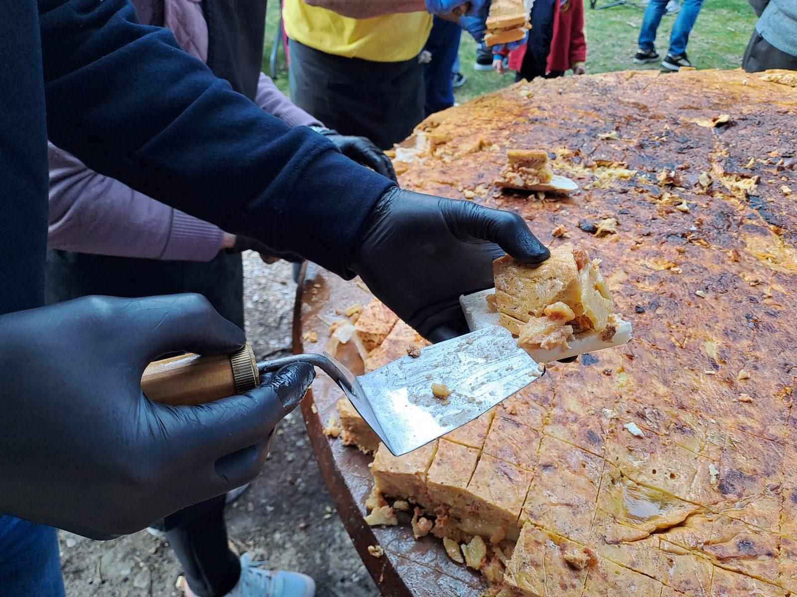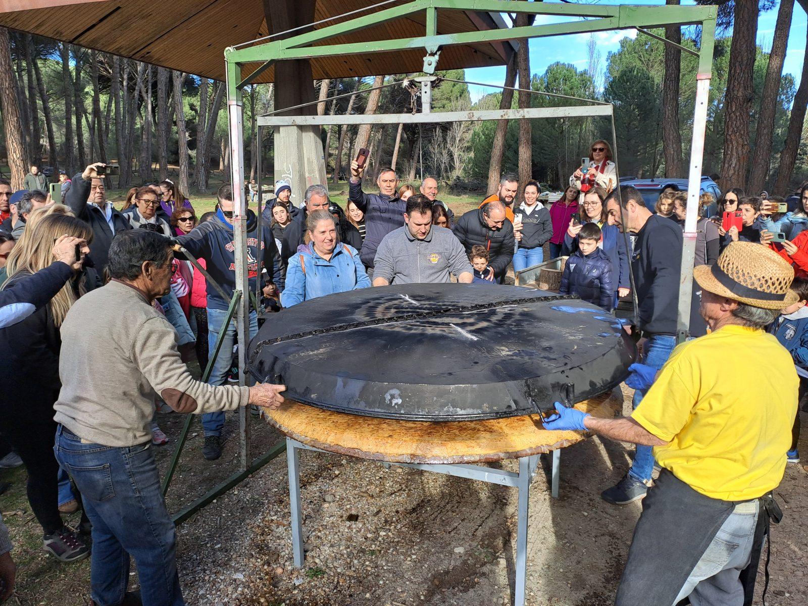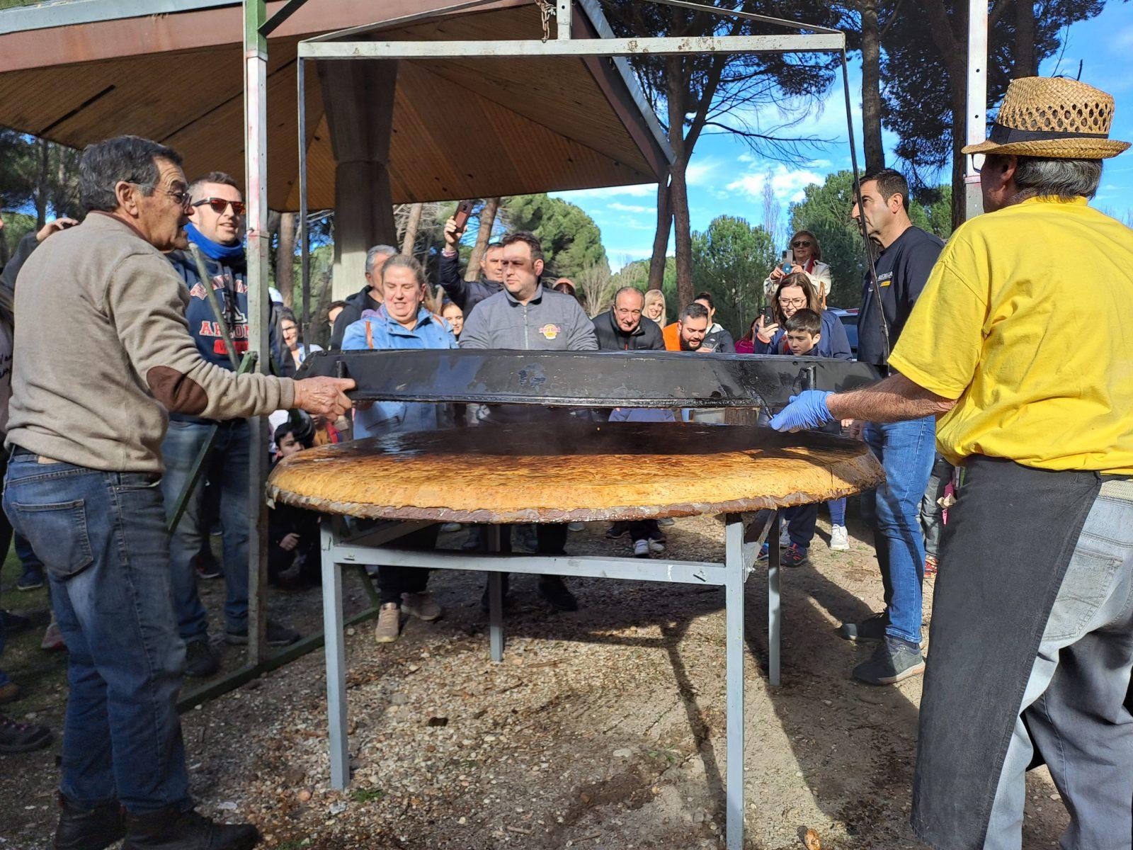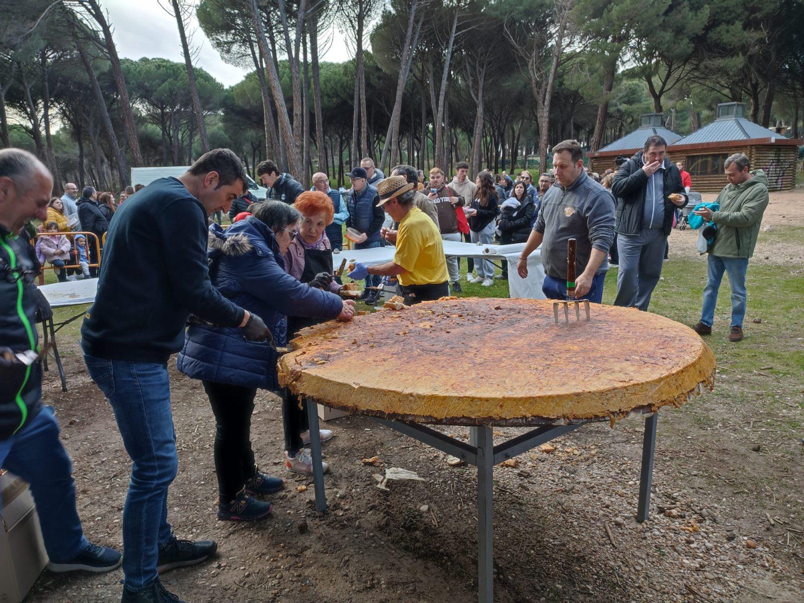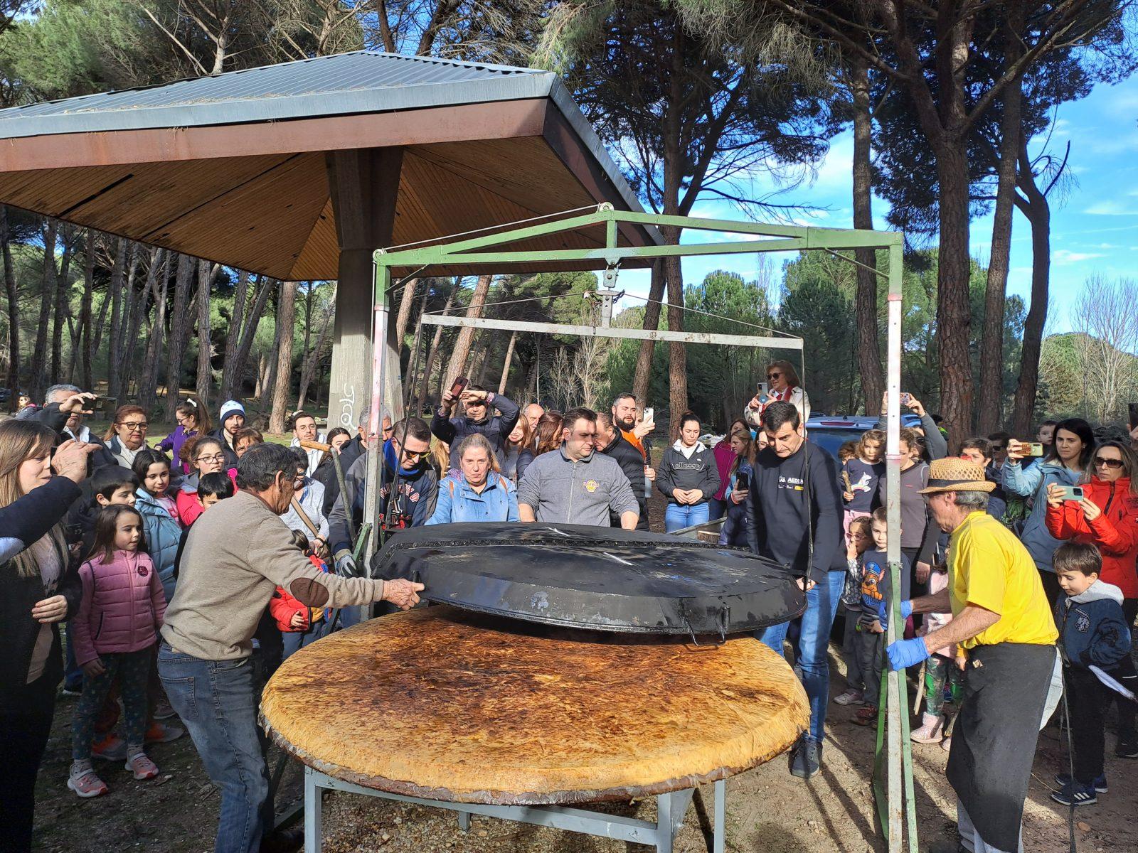 Tras este momento llegaba el más esperado de la tarde, el ver cómo se daba la vuelta a la gran tortilla elaborada por Jesús Martín Repiso, quien se encarga también del guiso de carne de toro con patatas en el tradicional día de las peñas de las fiestas patronales. Con un sistema de poleas elaborado por él mismo consigue girar la enorme sartén donde trae una tortilla que ha tardado más de 5 horas en elaborar. 150 kilos de patatas, 900 huevos, 18 kilos de jijas, 15 kilos de cebollas y 15 litros de aceite son los ingredientes de una receta que da como resultado esa tradicional tortilla del Día de la Vieja que es repartida junto con pan entre todos los asistentes que forman una larga cola para hacerse con este tradicional “manjar”.