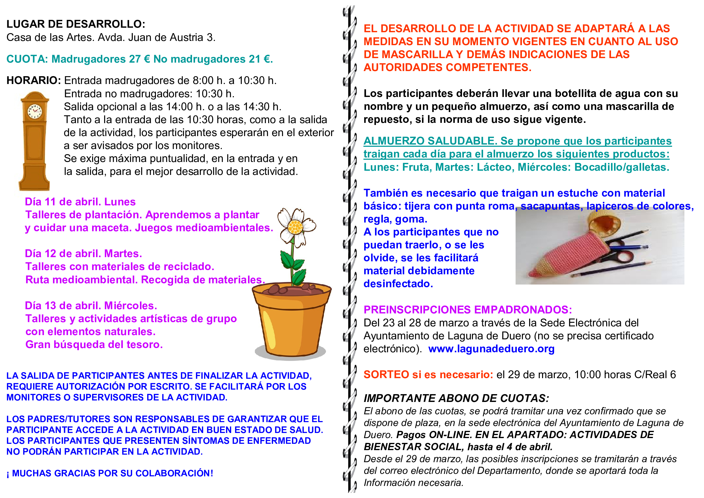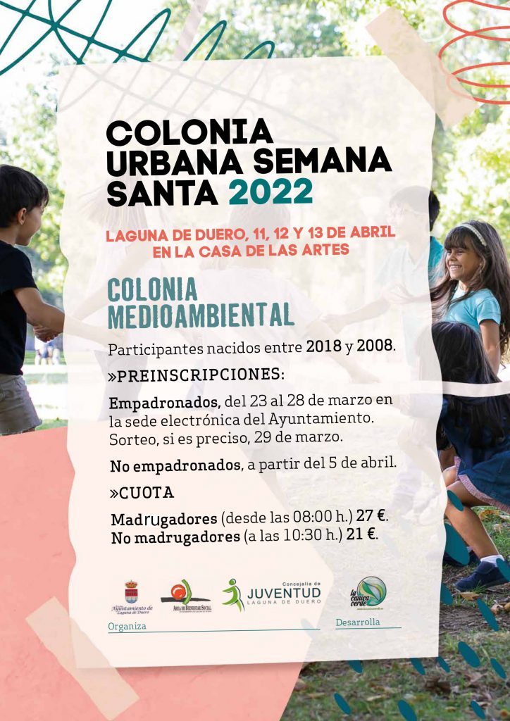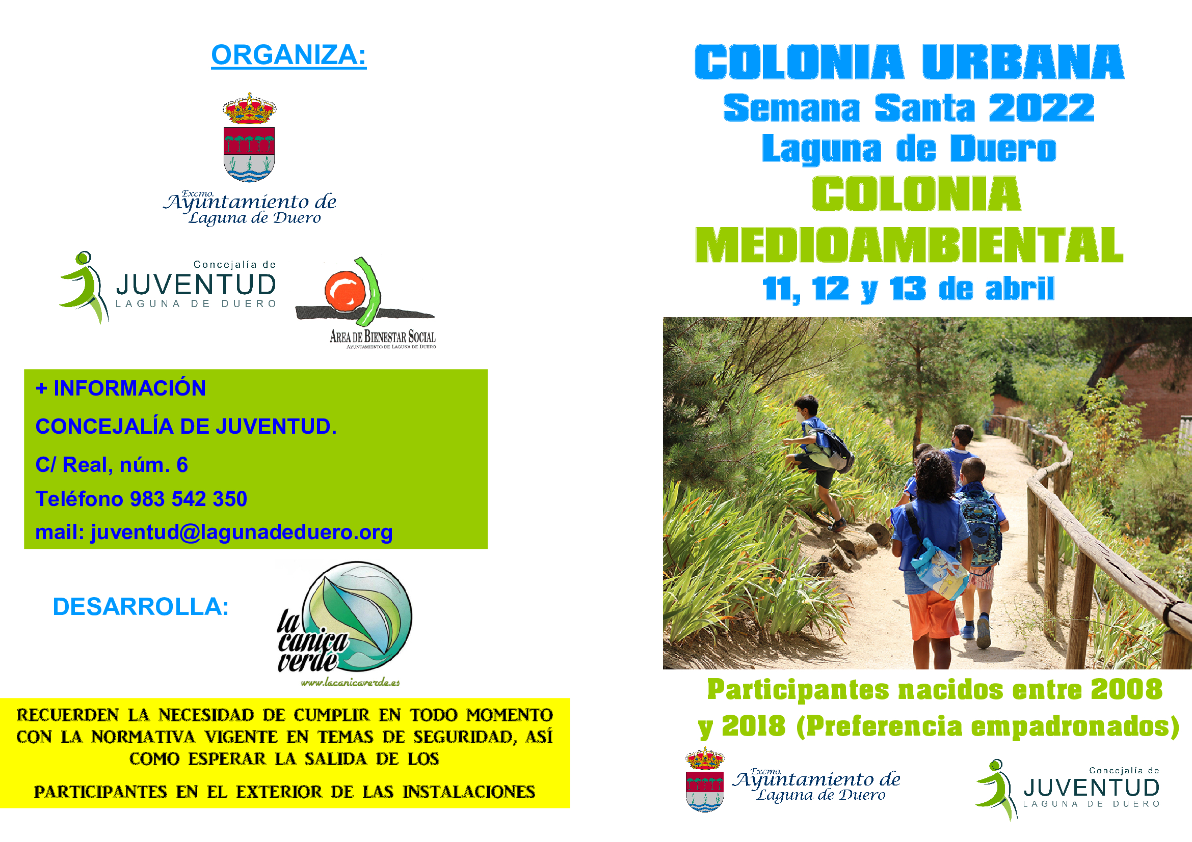 El Ayuntamiento de Laguna de Duero dede la Concejalía de Juventud, organiza durante las vacaciones de Semana Santa, los días 11, 12 y 13 de abril, en la Casa de las Artes, una COLONIA URBANA, bajo el título de COLONIA MEDIOAMBIENTAL, destinada a participantes, preferentemente empadronados en Laguna de Duero, nacidos entre 2008 y 2018.