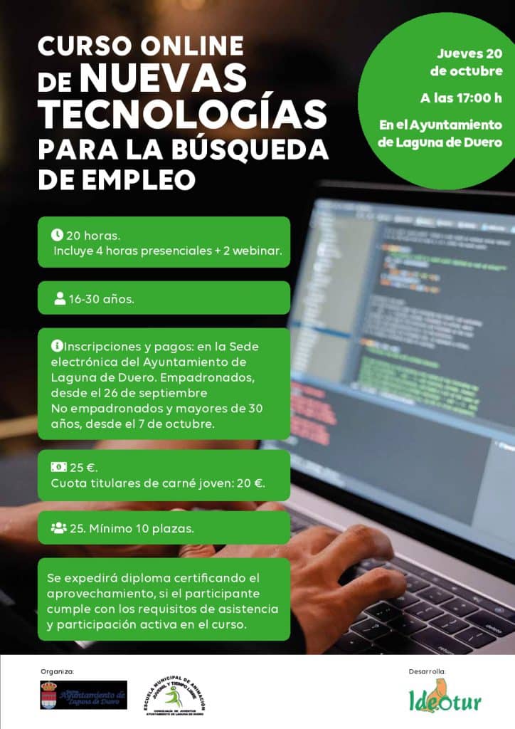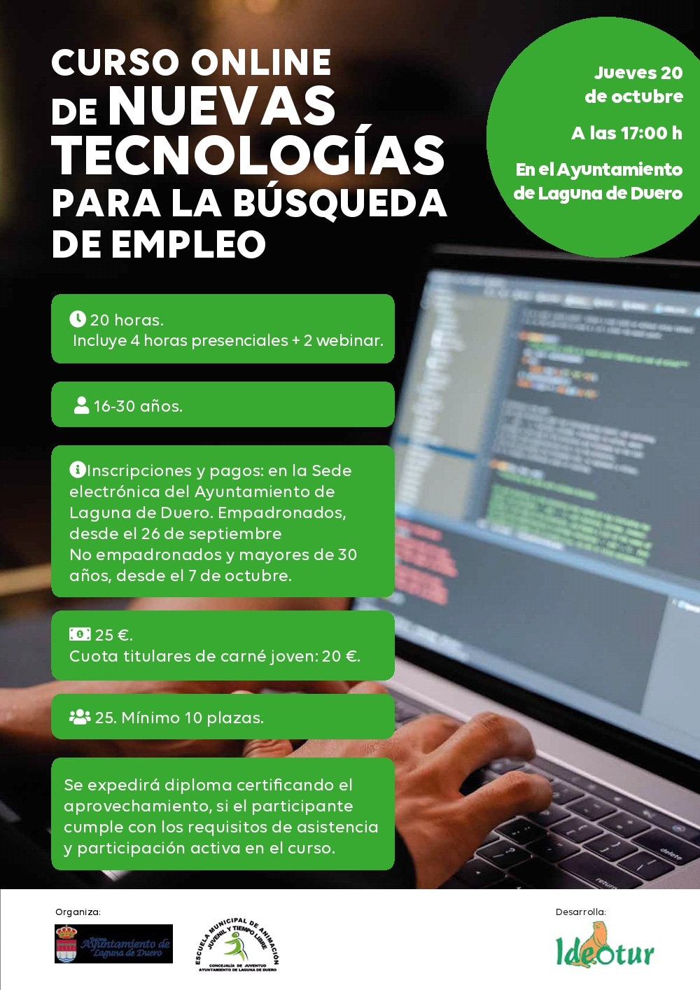La Escuela Municipal de Tiempo Libre del Ayuntamiento de Laguna de Duero, organiza este curso, cuyo objetivo es conocer los conceptos y aprender a diseñar estrategias, a la hora de buscar empleo en la red, todo ello, mediante ejemplos y casos prácticos. Durante el desarrollo del mismo, aprenderemos a buscar ofertas de empleo y a gestionar los diferentes medios que nos permitan generar oportunidades de entrevistas de trabajo.