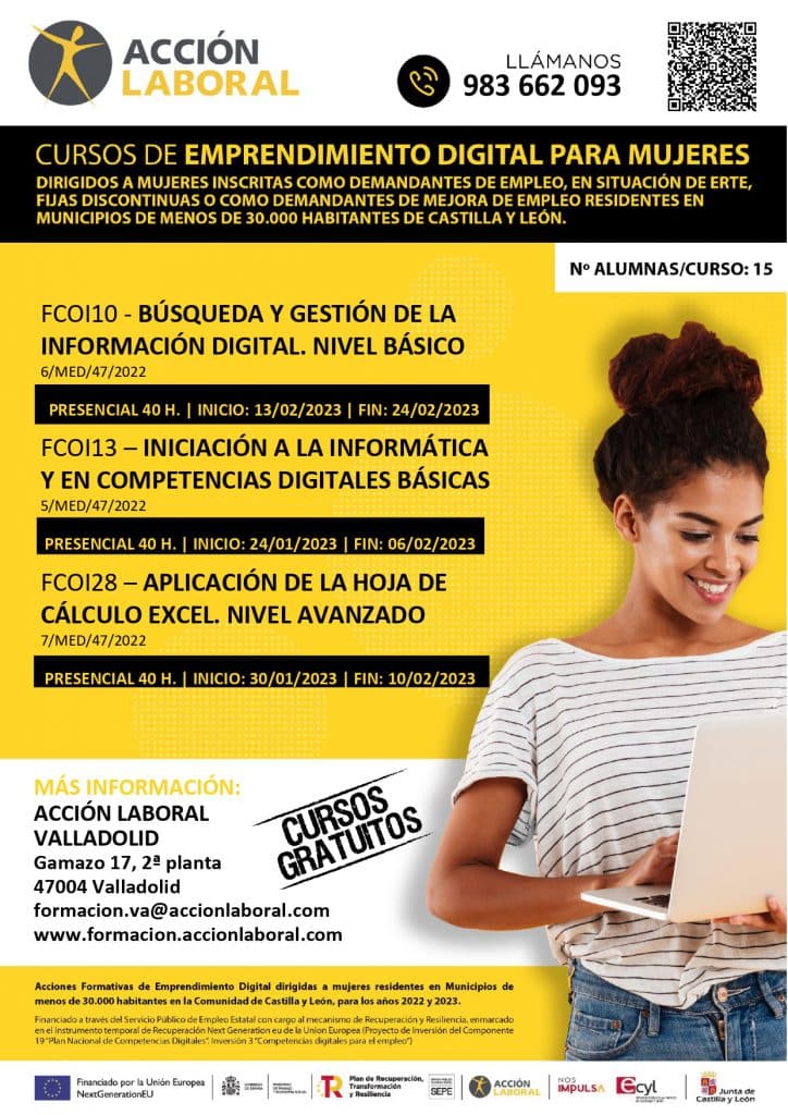 El Ayuntamiento de Laguna de Duero desde la Concejalía de Desarrollo Local y a través de Acción Laboral Valladolid informa sobre los cursos de Formación Digital dirigido a mujeres que están en Desempleo, ERTE o Mejora de Empleo (por ejemplo, mujeres trabajando a media jornada o cualquier tipo de Jornada parcial) o con Contrato Fijo discontinuo que además quieran reducir lo más posible su brecha digital.