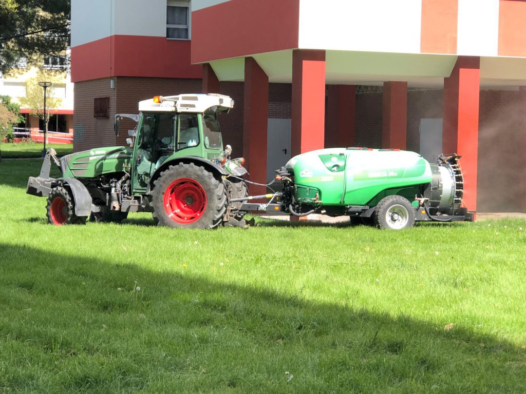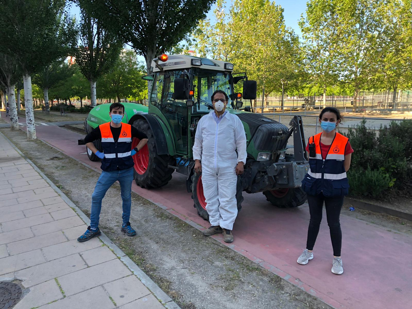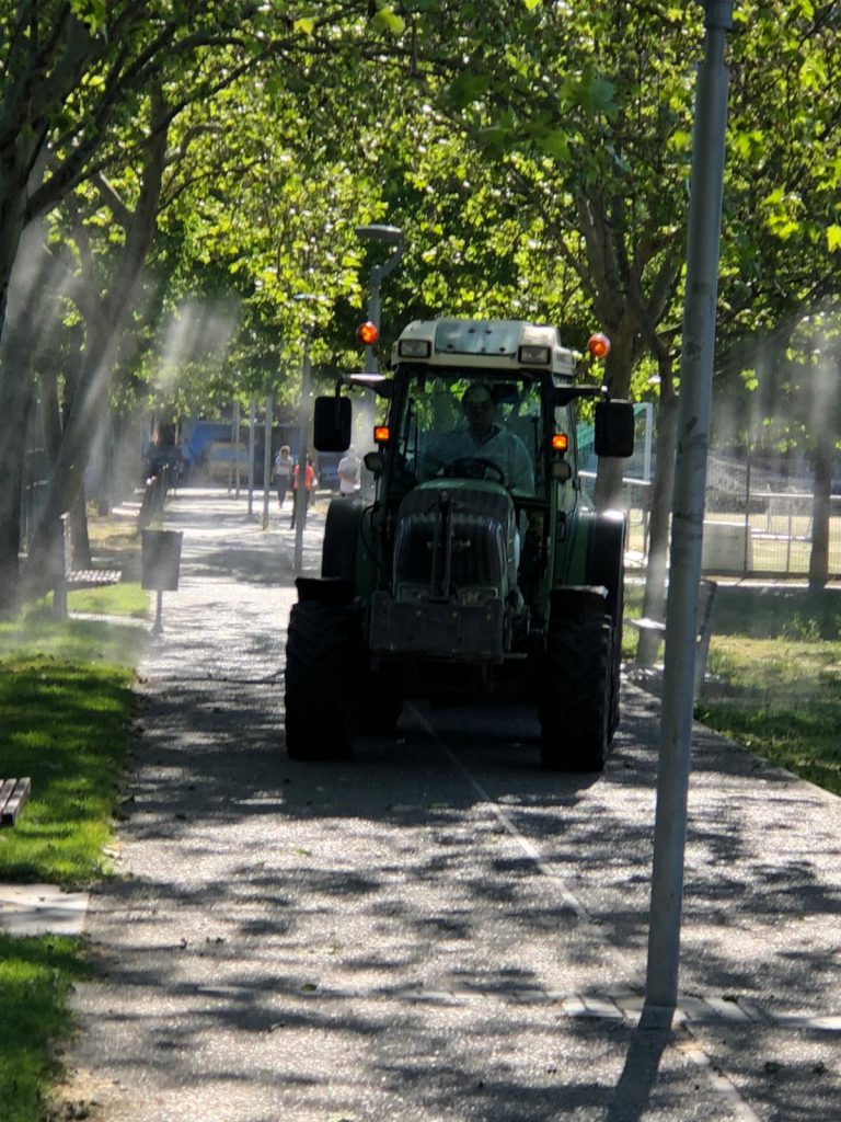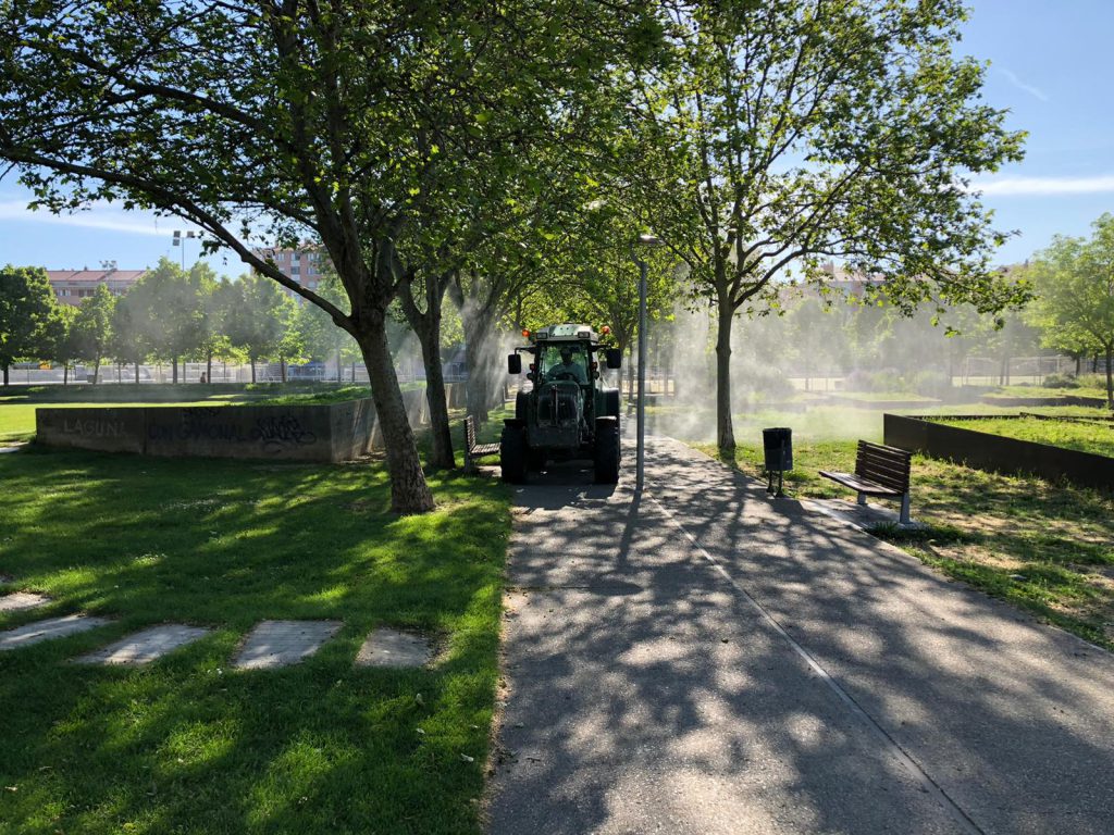 Durante la pasada tarde de realizan trabajos de intensa desinfección por parte de uno de los agricultores en las zonas de mayor volúmen de afluencia de personas:zona de Torrelago,el Paseo del Lago y los aledaños del Campo de Fútbol.
