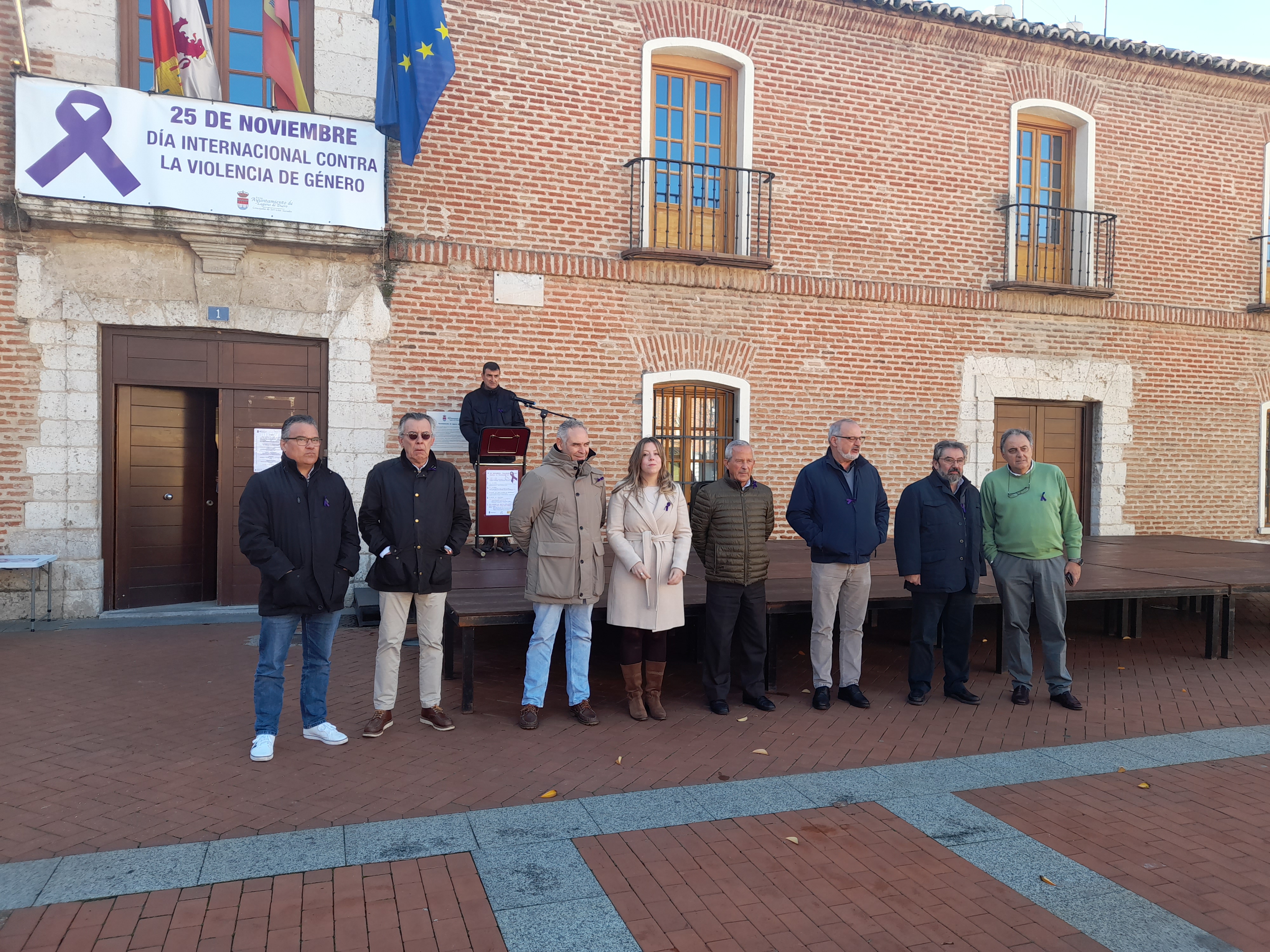 El alcalde de Laguna de Duero, Román Rodríguez de Castro, la concejal de Cultura, Lucía Castro, y el Concejal de Servicios Sociales, Fernando Vara, acompañados de varios concejales, conmemoran el día Internacional contra la Violencia de Género en un acto Institucional celebrado durante la mañana de hoy viernes 25 de noviembre en la Plaza Mayor del Consistorio.