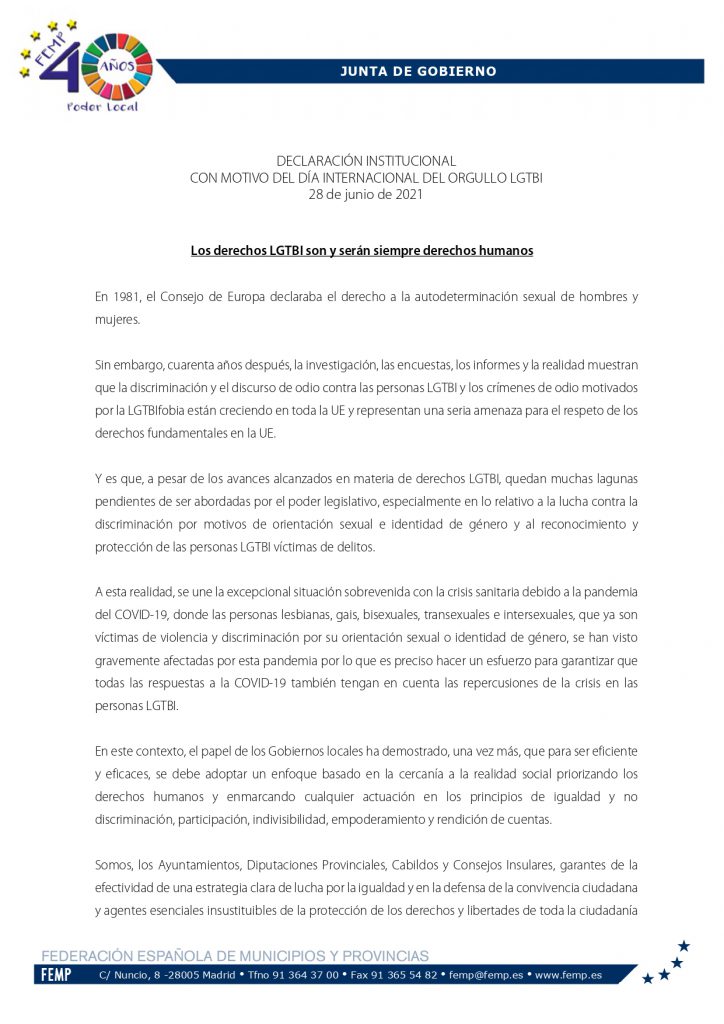 - Hoy, 28 de junio, se conmemora el día del Orgullo LGTBI (Lesbianas, Gays, Transexuales, Bisexuales, Intersexuales) y, en general, de todas las sexualidades y géneros diversos.