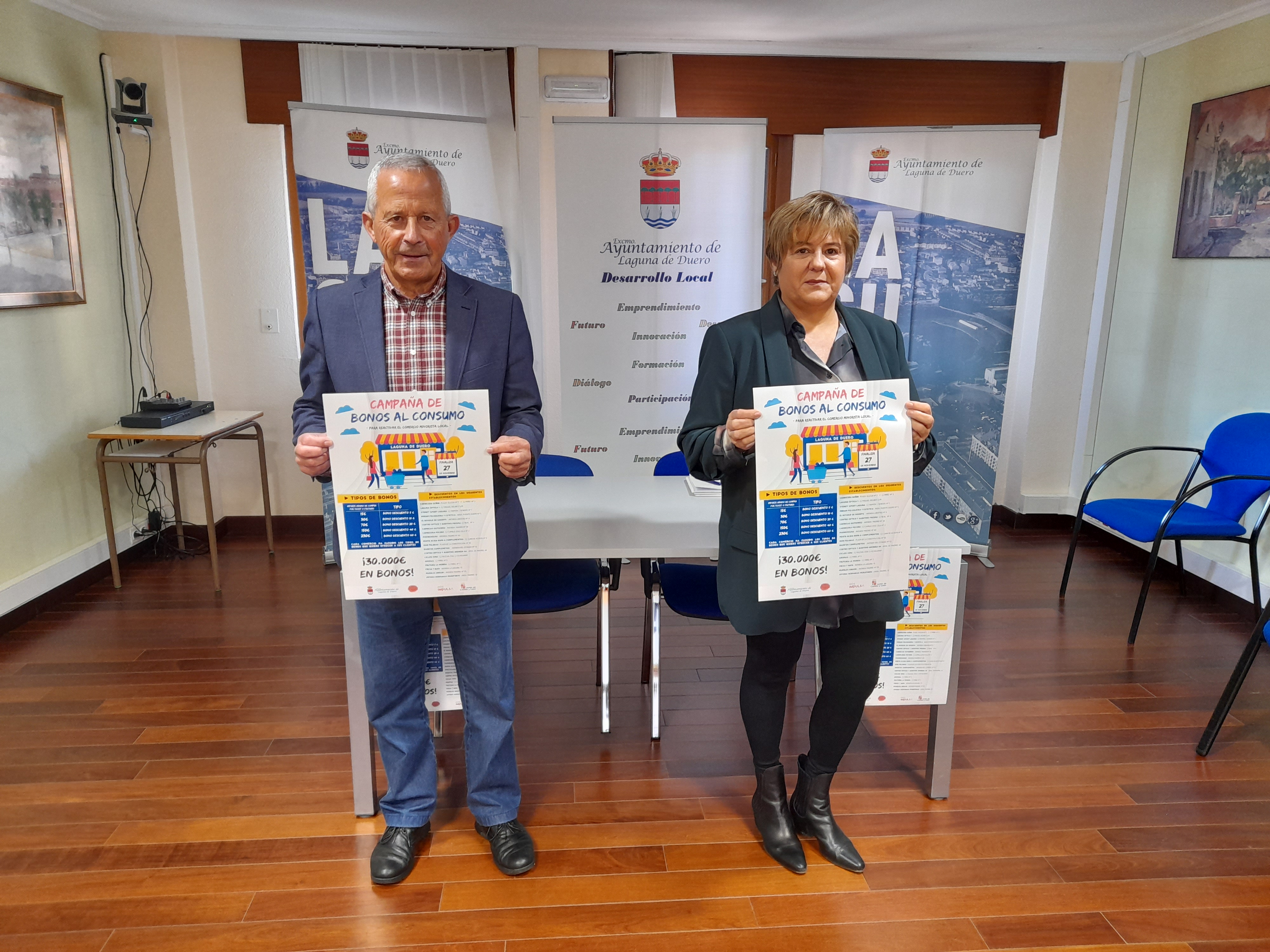 El alcalde de Laguna de Duero, Román Rodríguez de Castro y la concejal de Desarrollo Local, Ana Isabel Moya, presentan la Campaña de Bonos Al Consumo –Comprar en Laguna de Duero 2022.