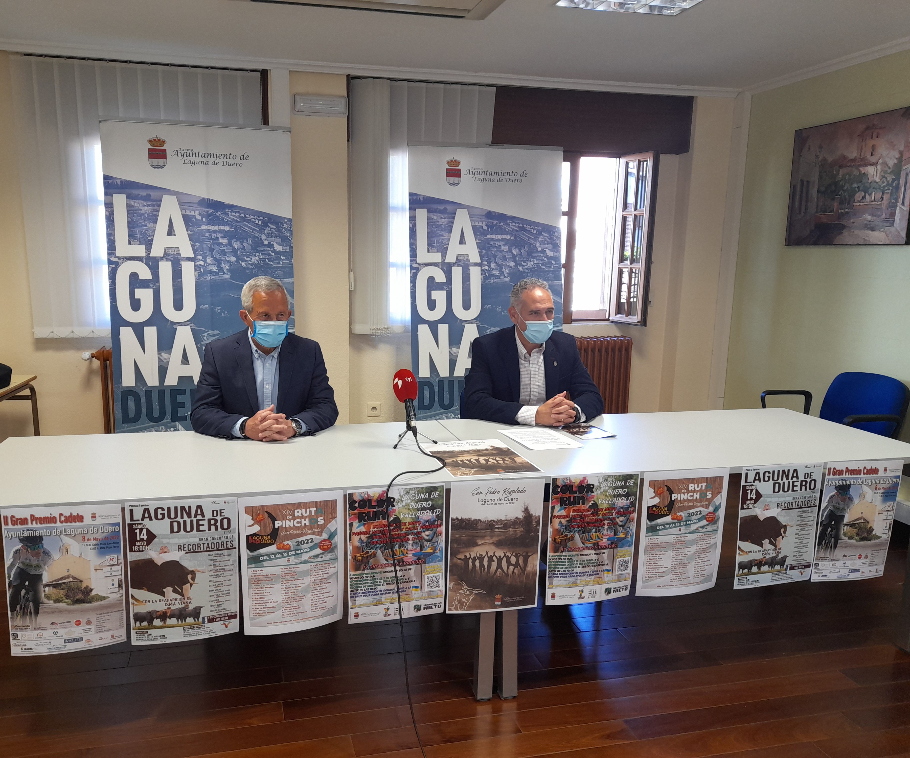 El alcalde de Laguna de Duero, Román Rodríguez de Castro y el concejal de Festejos Isidro Pérez presentan la programación Con motivo de las fiestas en honor a San Pedro Regalado 2022, amplia y variada para todas las edades, recuperando los tradicionales encierros, capeas, verbenas, discomovidas, teatro de calle, actuaciones musicales y como novedad la Gran Carrera de Colores “Color Run”, entre otras actividades lúdicas.