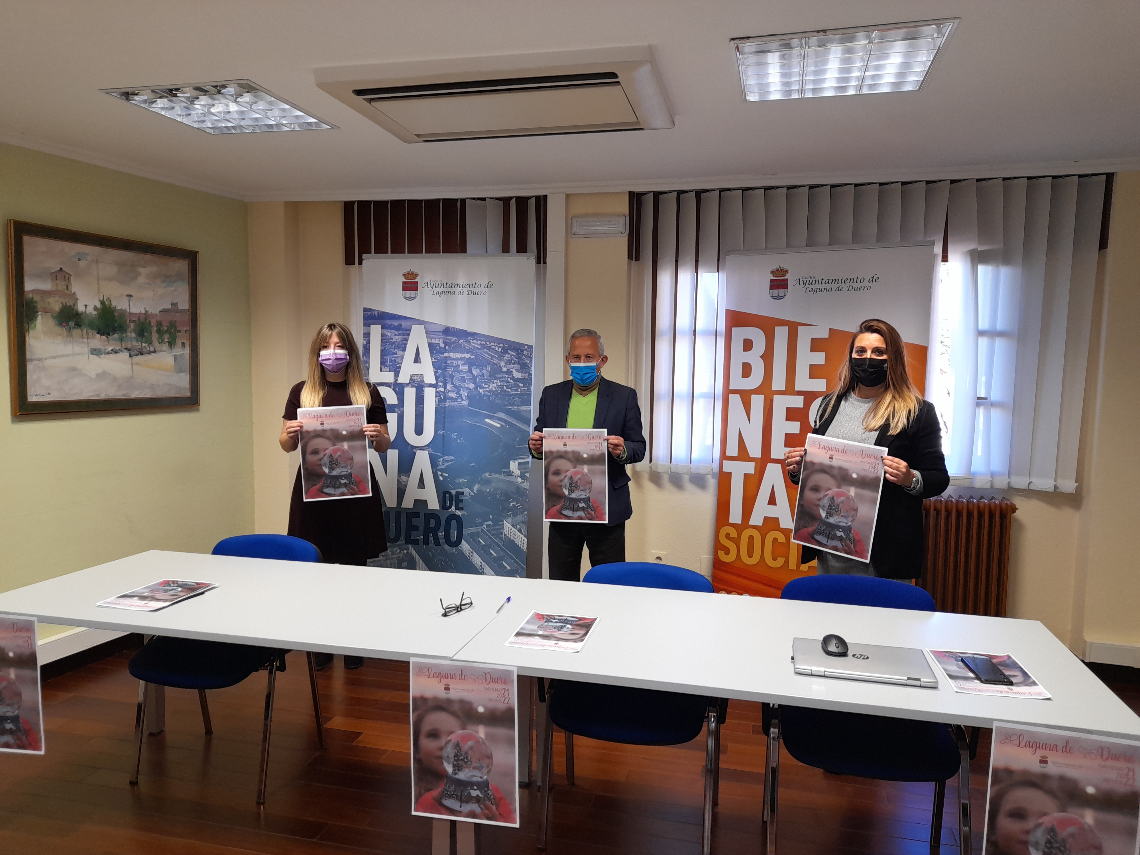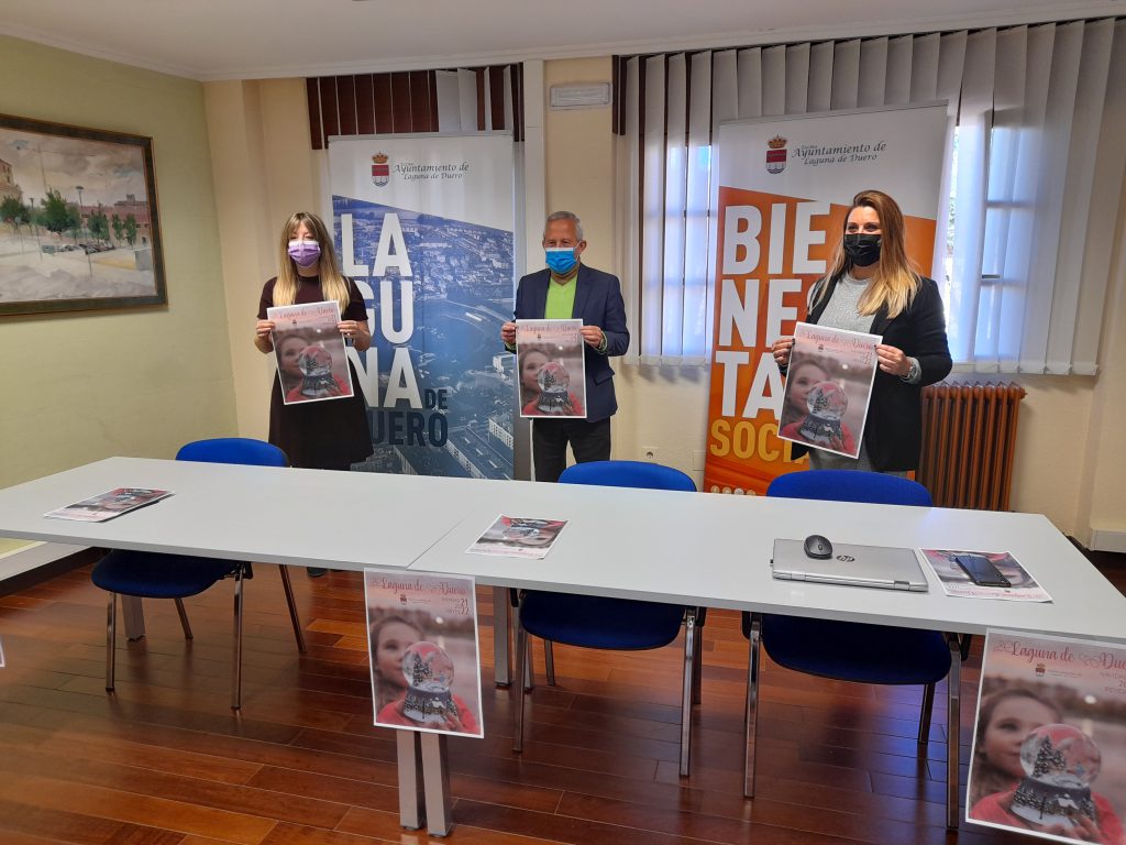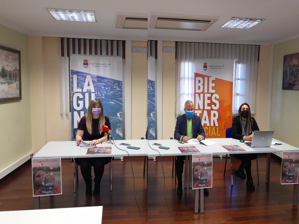 El alcalde de Laguna de Duero, Román Rodríguez de Castro, junto con la concejal del Área de Bienestar Social, Estela Crespo y la Concejal de Cultura, Lucía Castro, han presentado la programación que el Ayuntamiento ha preparado para celebrar la Navidad 2021 con actividades para todos los públicos que se iniciarán el próximo día 11 de diciembre en el acto del encendido navideño.