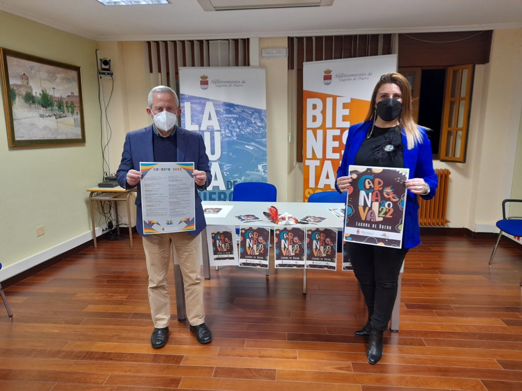El alcalde de Laguna de Duero, Román Rodríguez de Castro y la concejal del Área de Bienestar Social, Estela Crespo, presentan la programación de los Carnavales 2022.