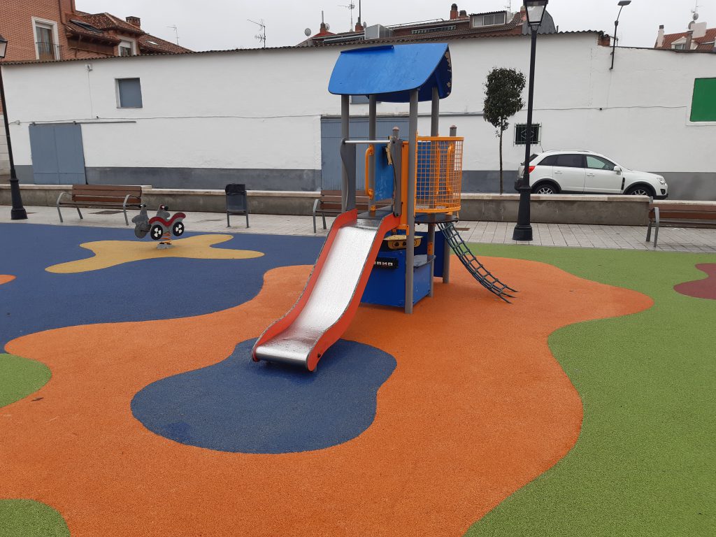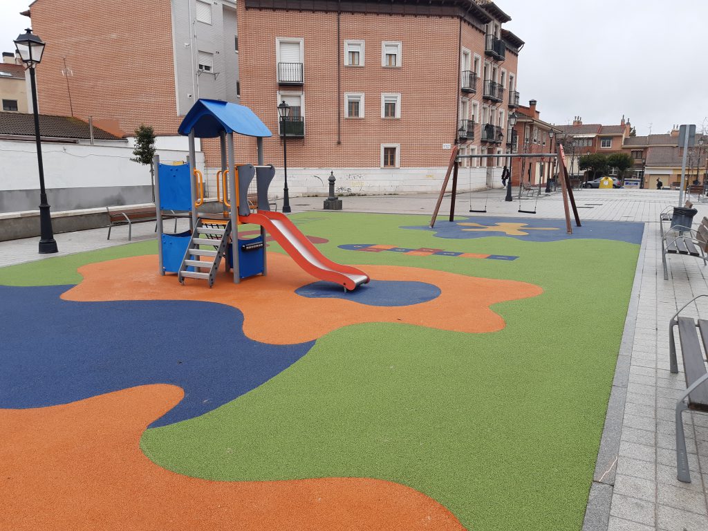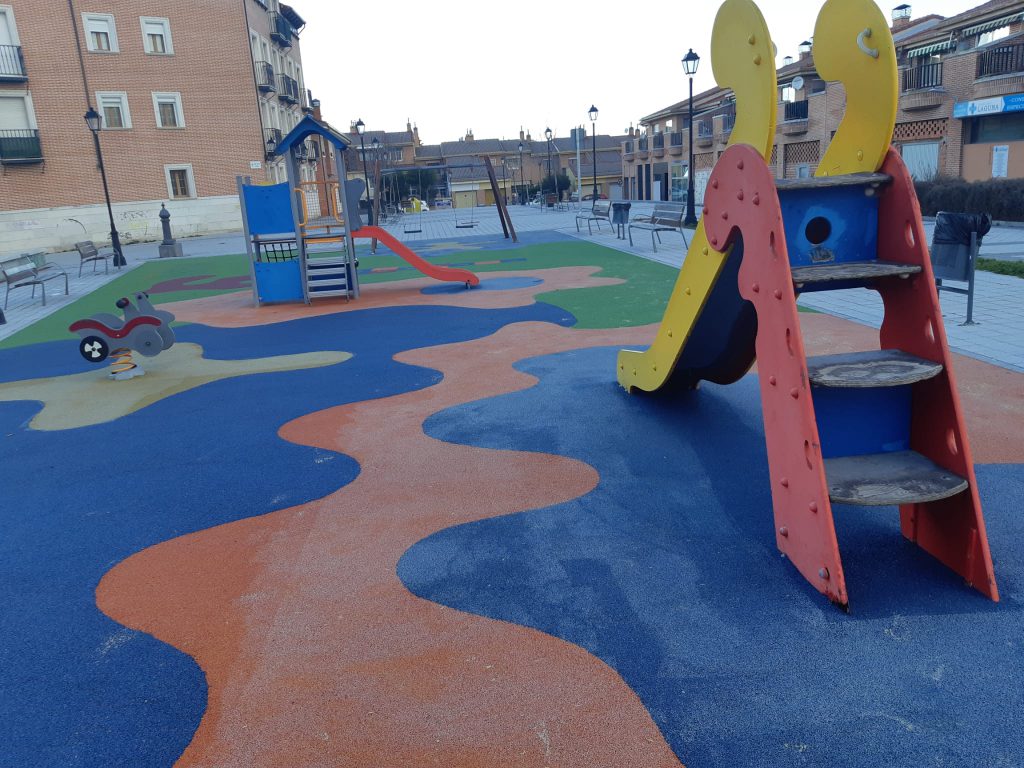 El Ayuntamiento de Laguna de Duero a través de los Servicios Técnicos realiza la remodelación del parque de la Plaza de los Hoyos con solado de caucho de seguridad infantil.