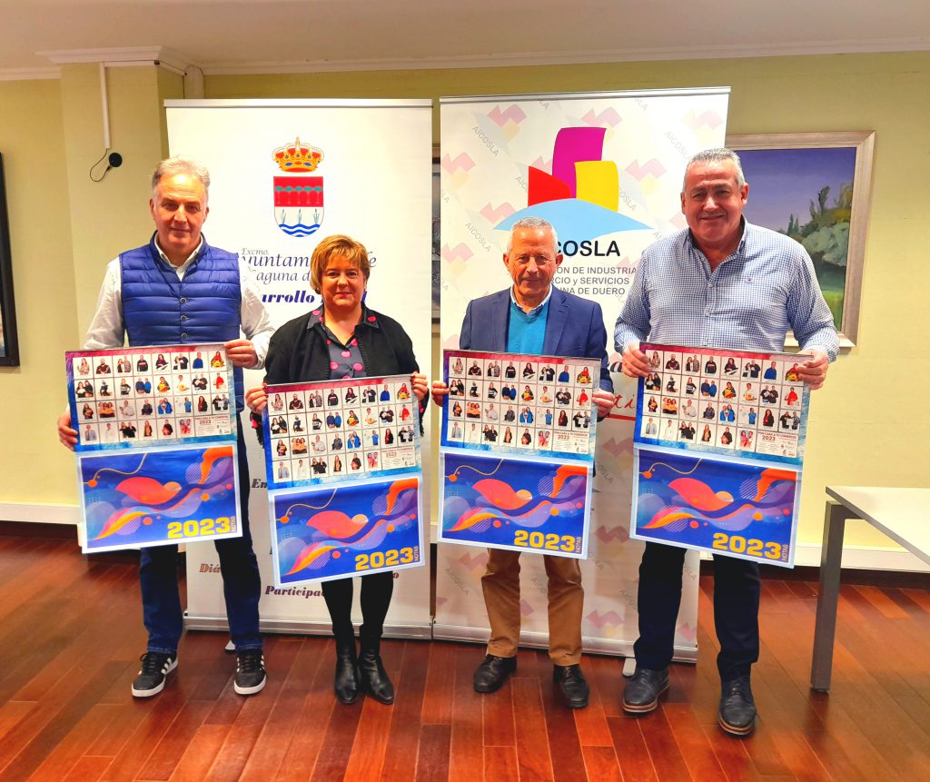 El alcalde de Laguna de Duero, Román Rodríguez de Castro, la concejal de Desarrollo Local, Ana Isabel Mota y la Asociación de Industria, Comercio y Servicios de Laguna de Duero, AICOSLA, ha presentado este viernes su calendario para el año 2023.