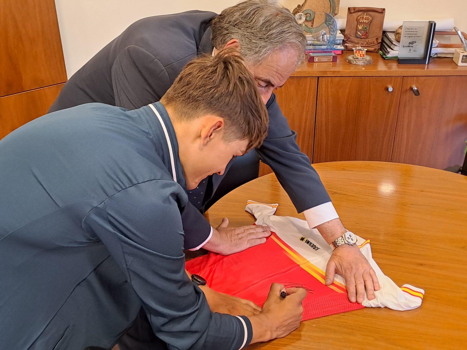 El ciclista ha querido tener un detalle con todos los vecinos de Laguna de Duero regalando al Consistorio su maillot de campeón firmado y dedicado a todos ellos. El alcalde, Avelino Álvarez, quien le ha recibido en su despacho, le ha felicitado de parte de todo el municipio, “deseando verle pronto de nuevo en el Ayuntamiento celebrando un nuevo título”.