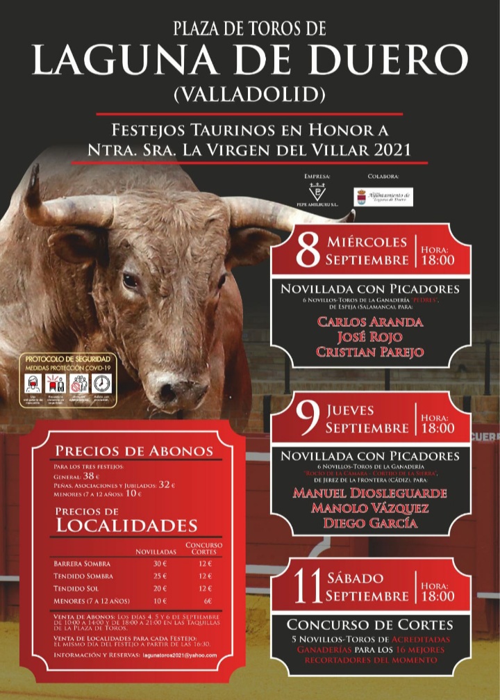 El Ayuntamiento de Laguna de Duero desde la Concejalía de Festejos presenta la Feria Taurina en Honor a la Virgen del Villar , los días 8,9 y 11 de septiembre respectivamente.