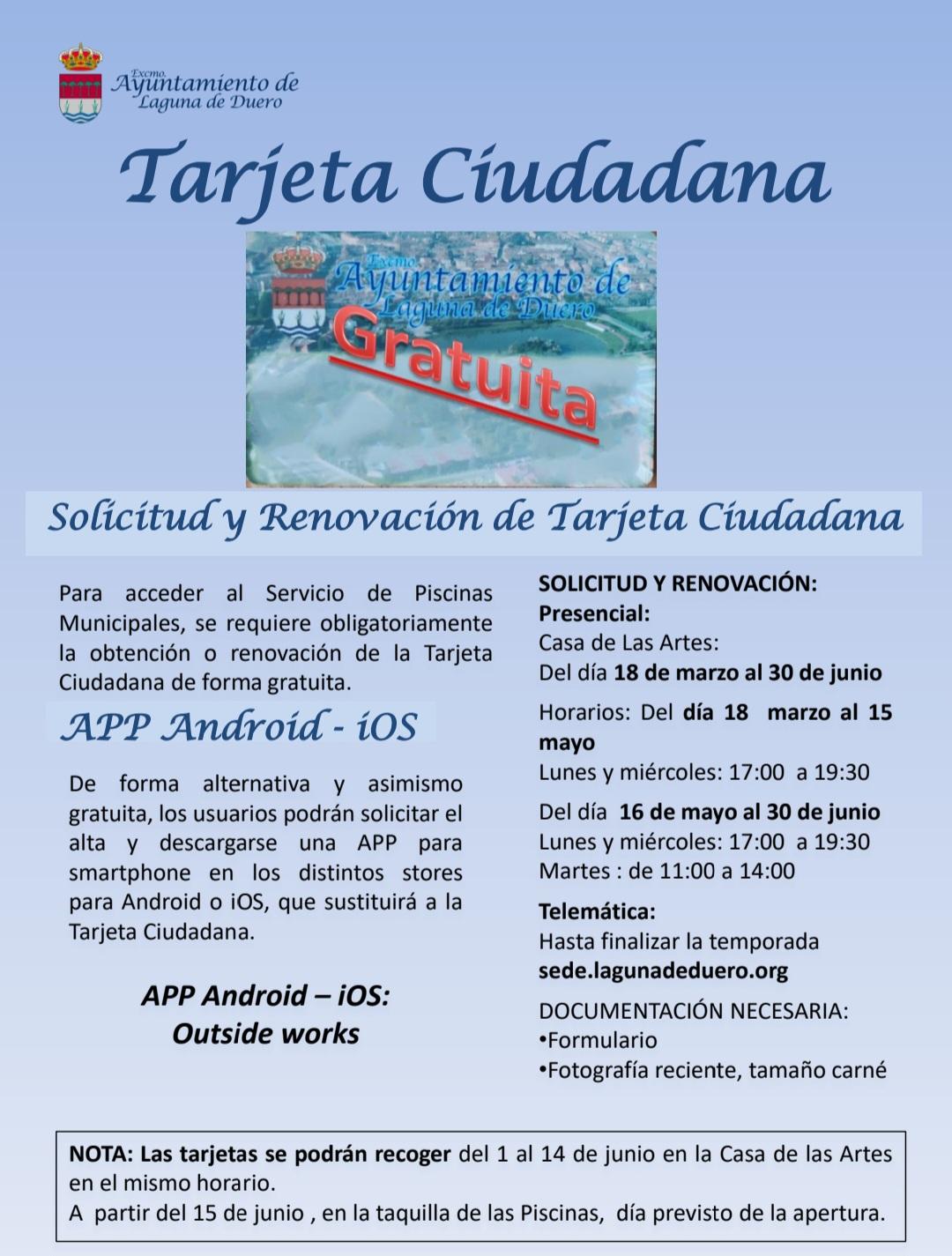 Se abre el plazo para solicitud y renovación de la Tarjeta Ciudadana de Laguna de Duero. La misma es completamente gratuita e imprescindible para poder acceder a la piscina municipal cuando dé comienzo su servicio a mediados del mes de junio.