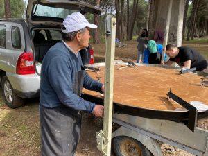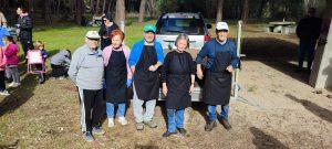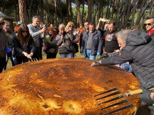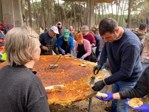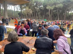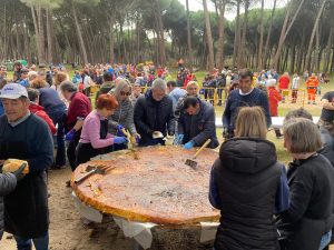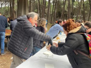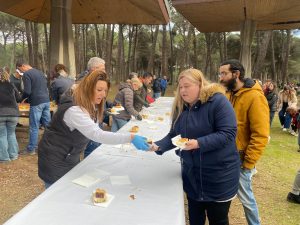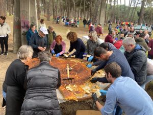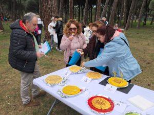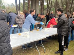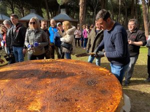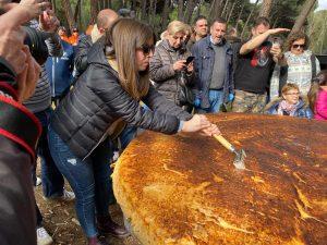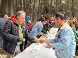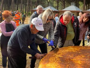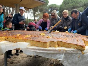 Sobre las 16:30 de la tarde llegaba la tortilla al pinar y lo que más expectación ha levantado, un año más, ha sido ver cómo la daban la vuelta. Cientos de curiosos esperaban en fila a poder catarla asomándose para contemplar ese admirado momento. En la partición y reparto de la misma han colaborado distintos miembros de la Corporación Municipal.