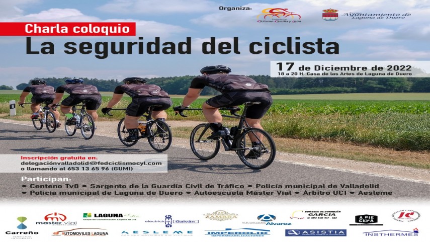 El Ayuntamiento de Laguna de Duero y la Federación de Ciclismo de Castilla y León (FCCYL) organizan el próximo sábado 17 de diciembre, de 18:00 a 20:00 horas en La Casa de Las Artes la charla coloquio ‘La seguridad del ciclista’. Un encuentro, para federados a partir de 15 años cuya inscripción es gratuita hasta completar aforo, que abordará entre otros temas: la Normativa de la DGT para el ciclista, cómo circular en un entrenamiento, cómo debe circular el coche de acompañamiento de entrenamiento, cómo deben circular ciclistas y directores en competición, cómo evitar accidentes o casos y lesiones que provocan los accidentes.