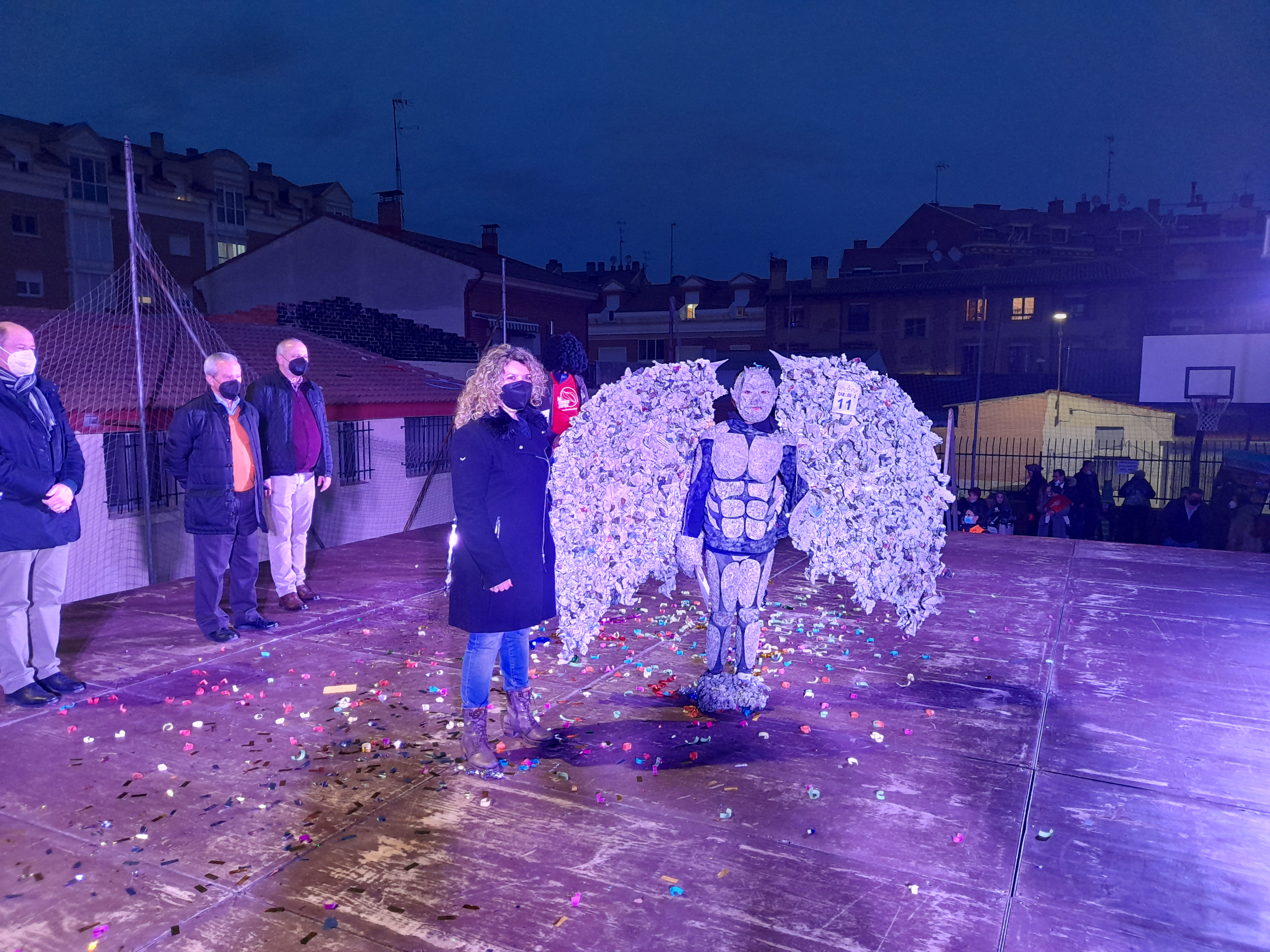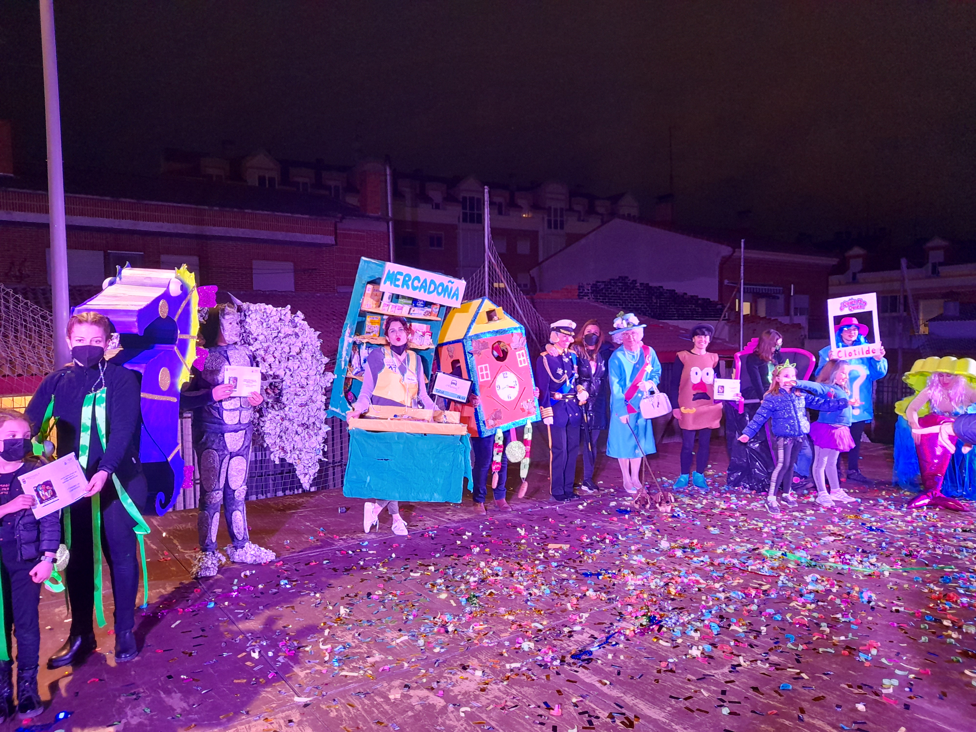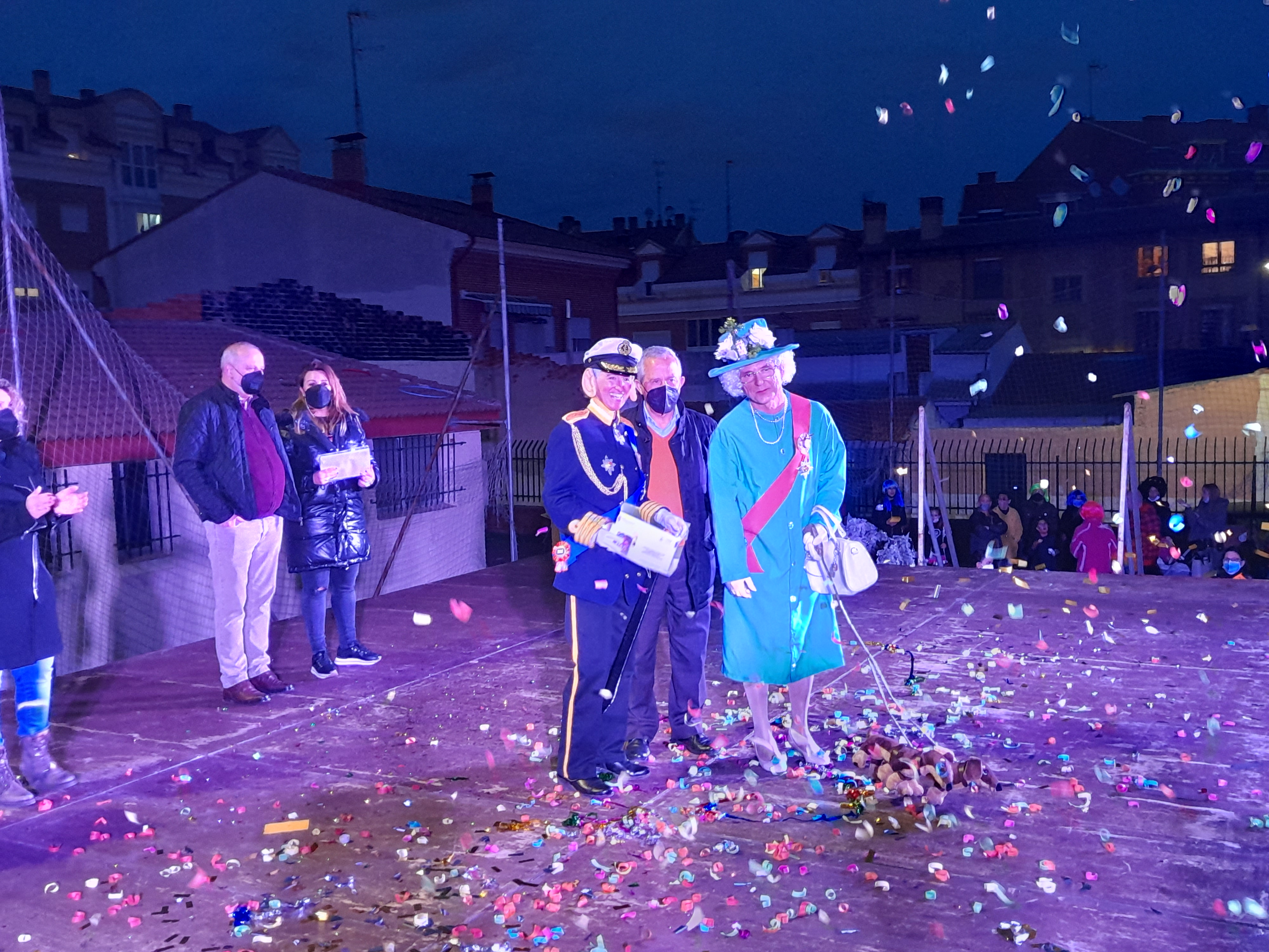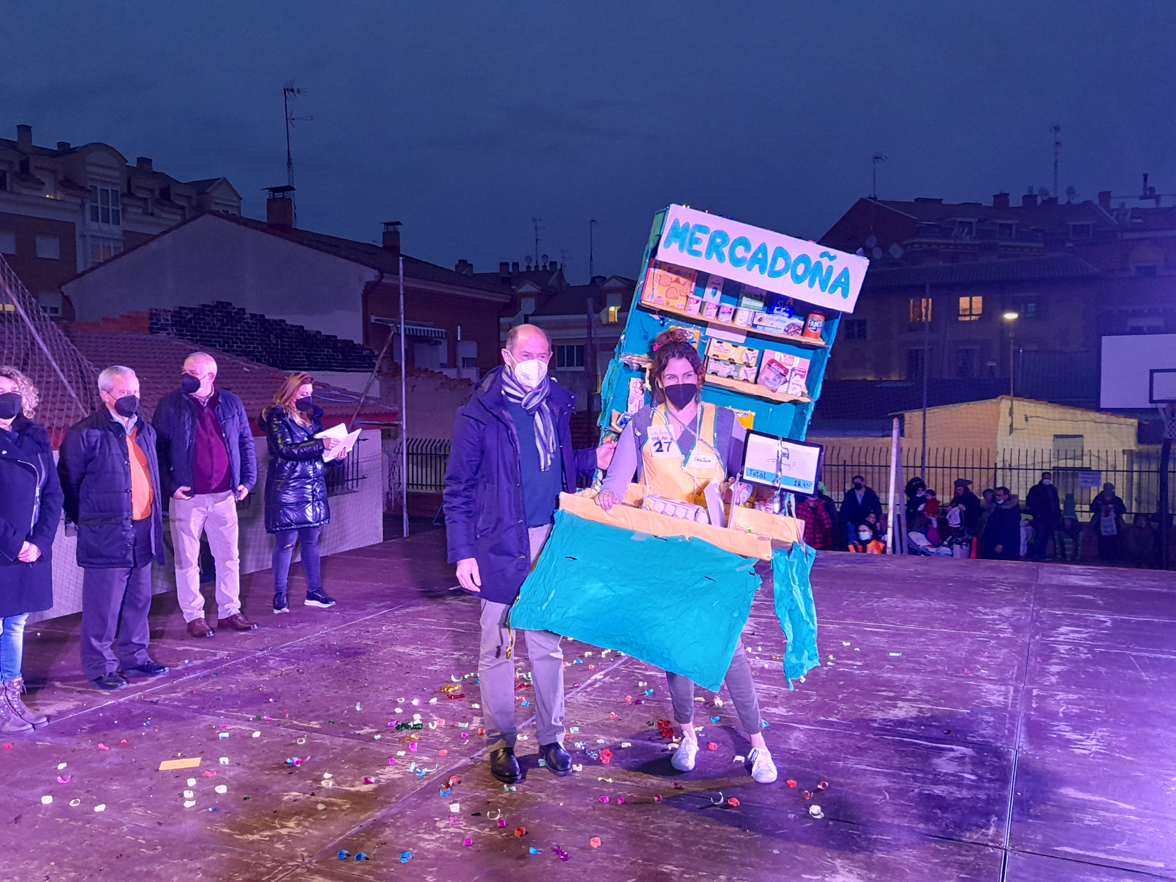 El primer premio individual -dotado con 150 euros- fue para la propuesta ‘Gárgolas’, realizada con papel de periódico entre otros elementos, mientras que el segundo -con 75 euros- fue a parar a ‘Mercadoña’, un guiño a la cadena de supermercados. Además, el premio al disfraz en pareja -dotado con 100 euros- fue para ‘Espera sentado Carlos’, una homenaje a la monarquía británica. Tras la entrega de premios, se procedió a la tradicional quema de la sardina.