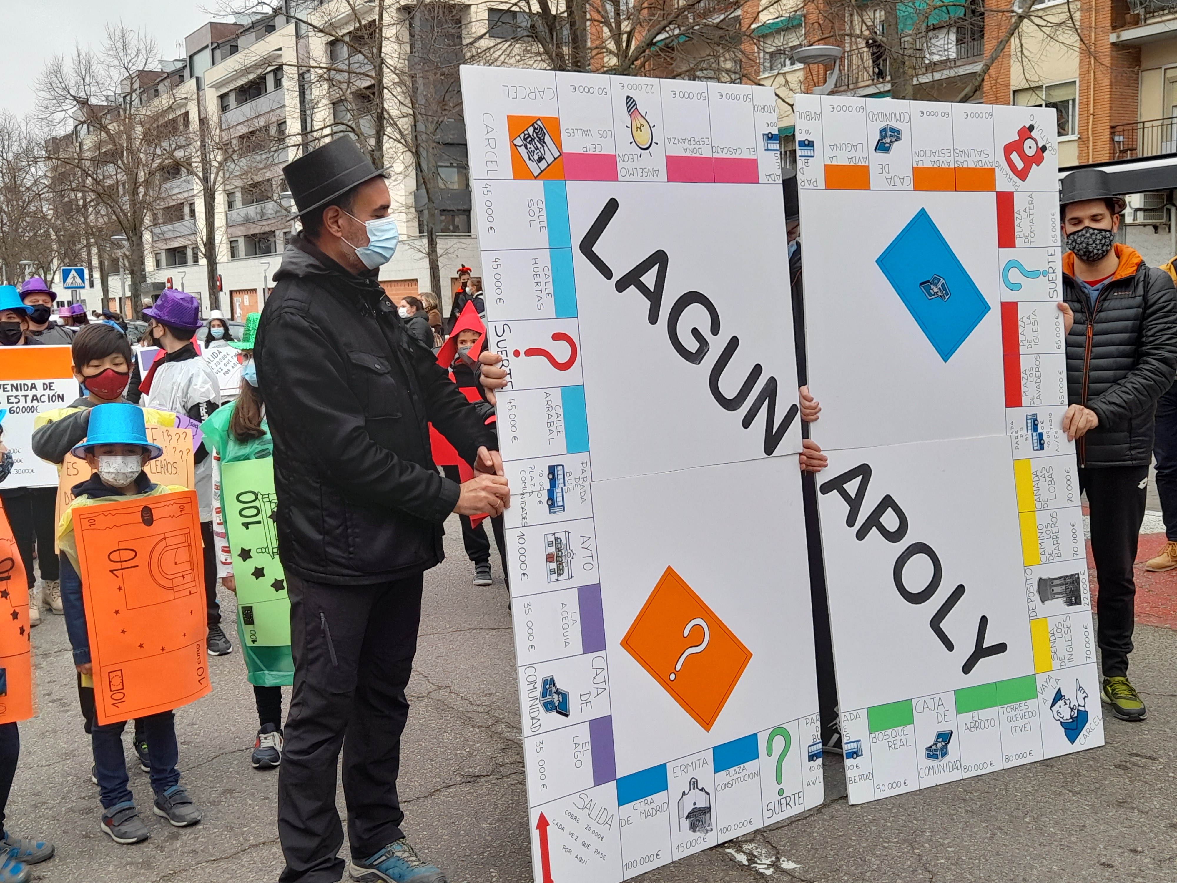 Los laguneros y laguneras se han reencontrado con el carnaval con más ganas que nunca. Tras un año de ausencia por culpa del Covid, cientos de familias han tomado este martes las calles, para disfrutar de las fantasías, las máscaras, los disfraces, el ambiente festivo y la música. El pasacalle comenzó sobre las 17:30 de la tarde realizando un recorrido por las Calles principales del muncipio: Calle Caballeros,-Avenida de Valladolid-Avenida Madrid-Calle Castilla y Calle Cascajo, hasta llegar a la pista deportiva del Centro Cívico el Cascajo. Una gran batucada acompañada de un novedoso dragón realizado con globos que recorría las calles acechando a los participantes.