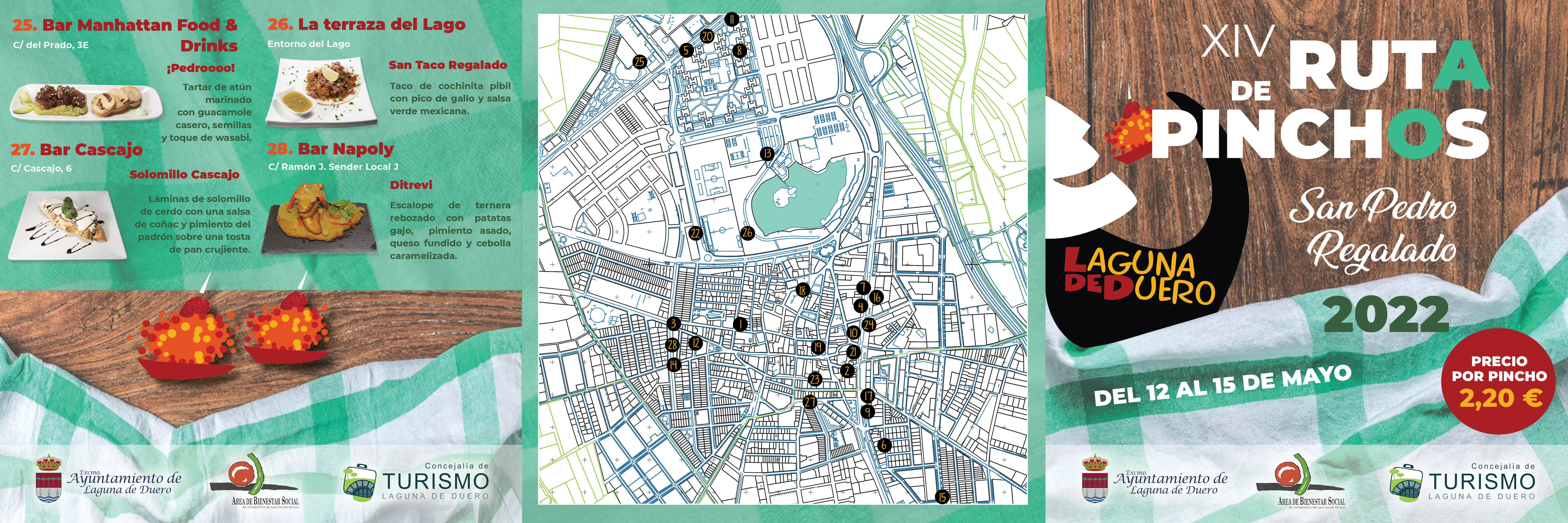 El Ayuntamiento de Laguna de Duero desde la Concejalía de Turismo recupera la tradicional Ruta de los Pinchos, un evento consolidado, los amantes del buen comer y de la gastronomía local, podrán disfrutar del 12 al 15 de Mayo de la XIV edición de la Ruta de Pinchos de San Pedro Regalado de Laguna de Duero.