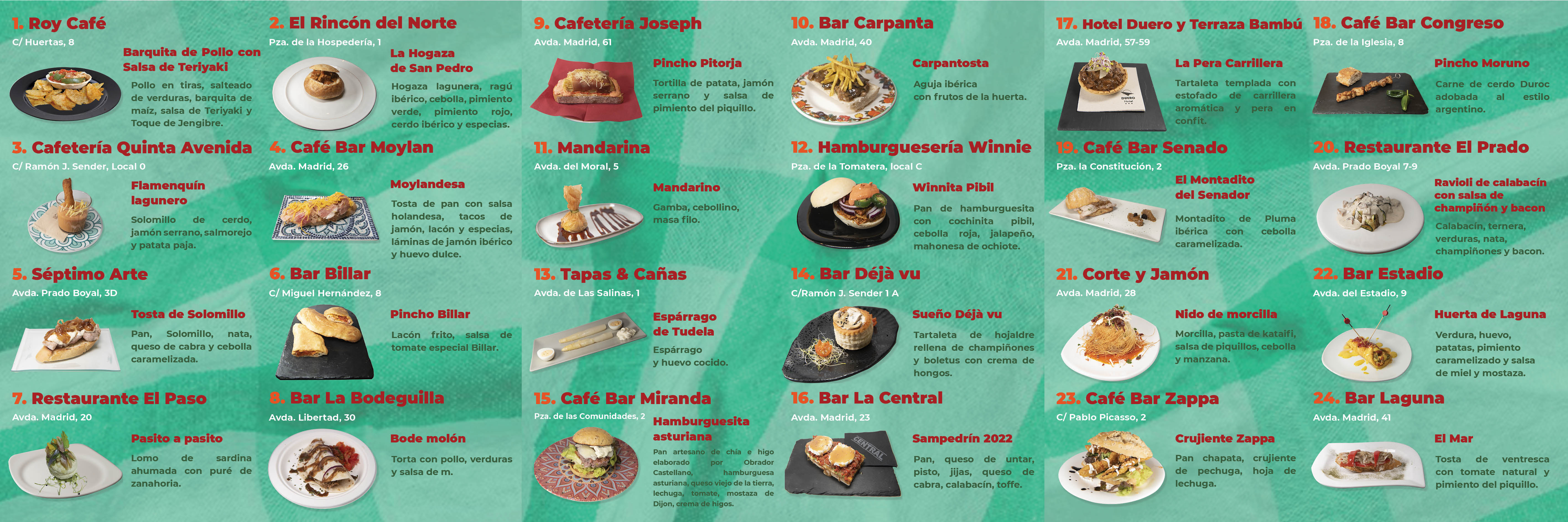 28 establecimientos participan en esta cita: Hotel Duero y Terraza Bambú, Bar Carpanta, Bar Laguna, Café Bar Senado, Hamburguesería Winnie, Moylan, El Paso, Bar Estadio, Roy Café, Séptimo Arte, El Prado, Miranda, Bar Billar, Bar Manhattan,Café Bar Zappa, La Terraza del lago Bar Cascajo, Quinta Avenida, El rincón del Norte, Mandarina Food &Drinks, Bar Napoly, Café Bar el Congreso, Bar la Central, Corte y Jamón, Tapas y Cañas, Bar la Bodeguilla, Cafetería Joseph y Bar Déjà vu.