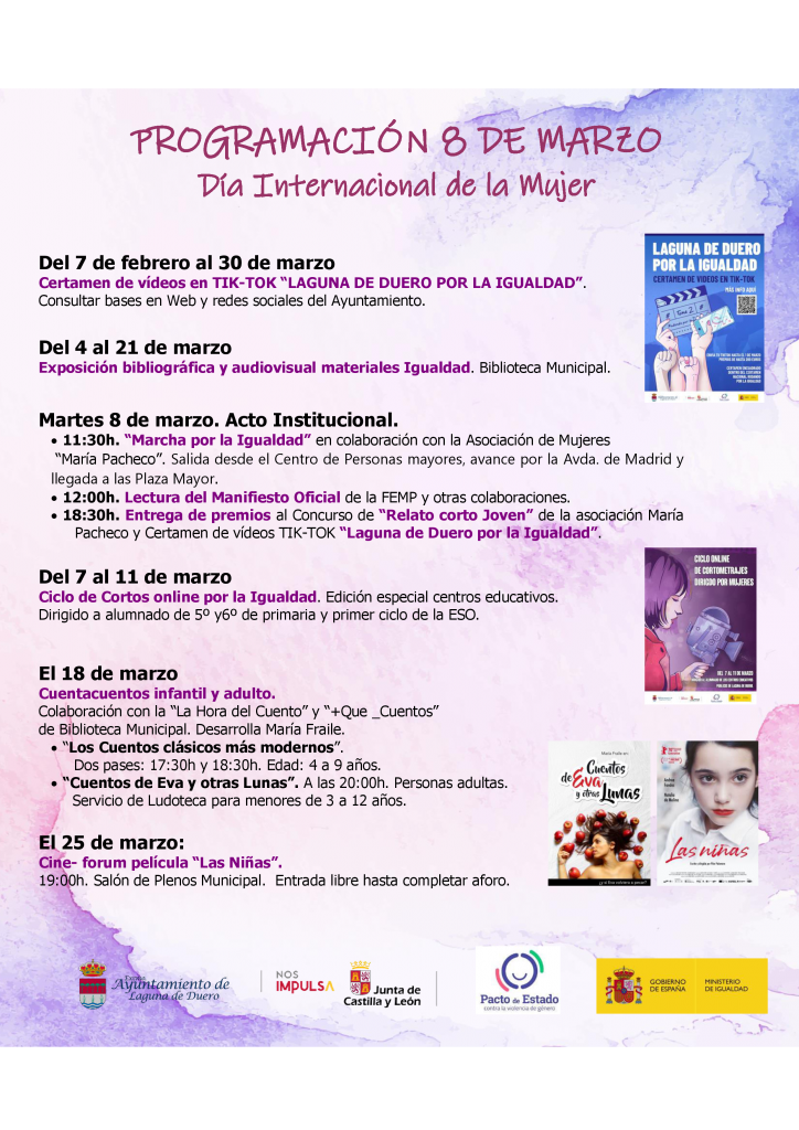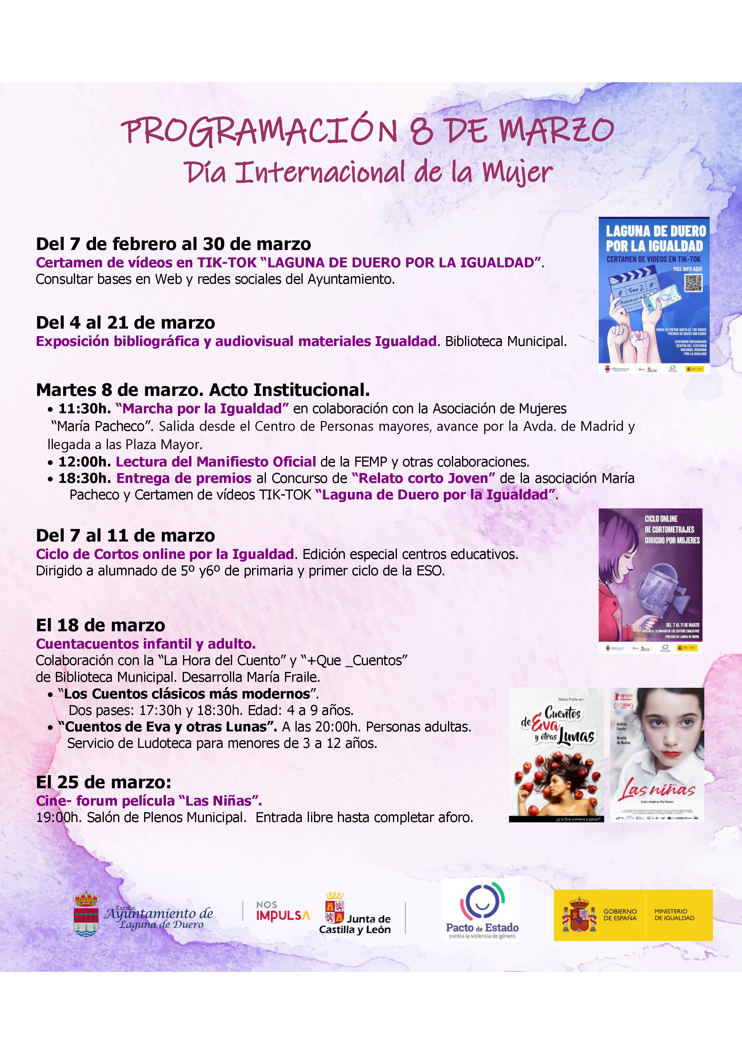 - El martes 8 de marzo tendrá lugar el Acto Institucional con la lectura del manifiesto y por la tarde la entrega de premios al Concurso de “Relato Corto Joven”de la Asociación María Pacheco y Certamen de Vídeos TIK-TOK “Laguna de Duero por la Igualdad“