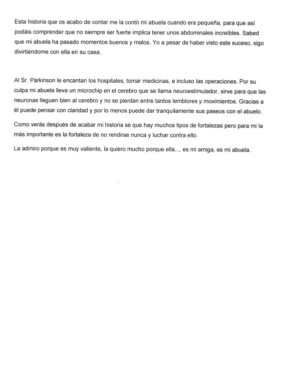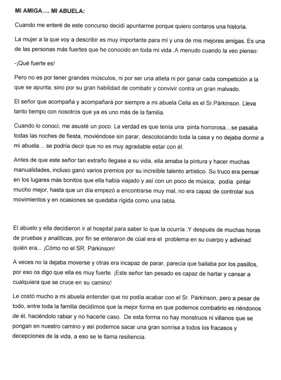 El primer premio fue a parar a Lucía Gutiérrez, por relato titulado ‘Mi amiga, mi abuela’, emotivo y profundo, inspirado en las consecuencias de la enfermedad del Parkinson y en la resiliencia necesaria para hacer frente a los problemas. El segundo premio fue para Paula González por su narración ‘Hay hadas en todas las partes del mundo’, y el tercero fue para Asier Aragón por su cuento ‘Veo veo’.