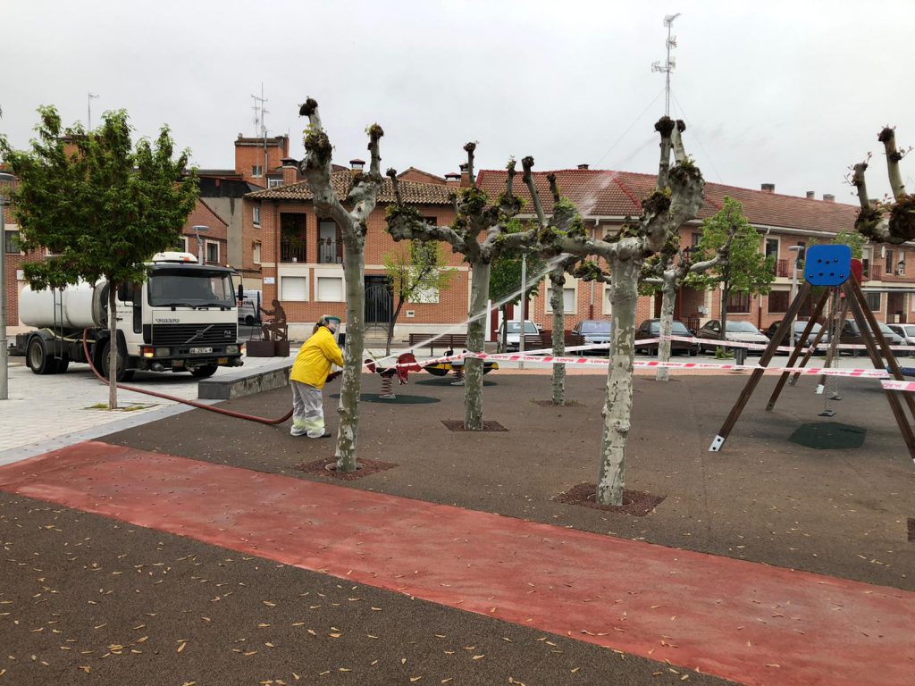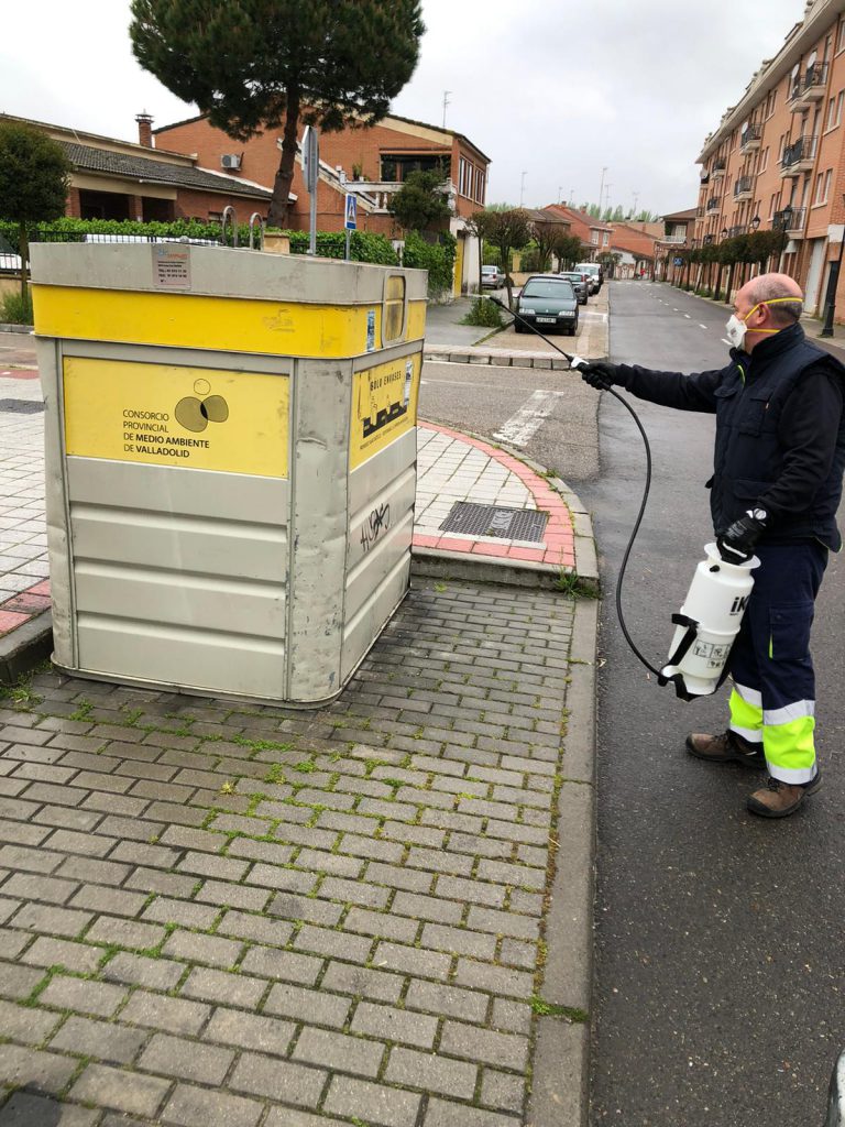 Además de realizar las labores diarias de recogida de basura y residuos.Se intensifica la desinfección en diferentes zonas de Laguna de Duero,las de mayor afluencia.Asimismo, contenedores y asas.