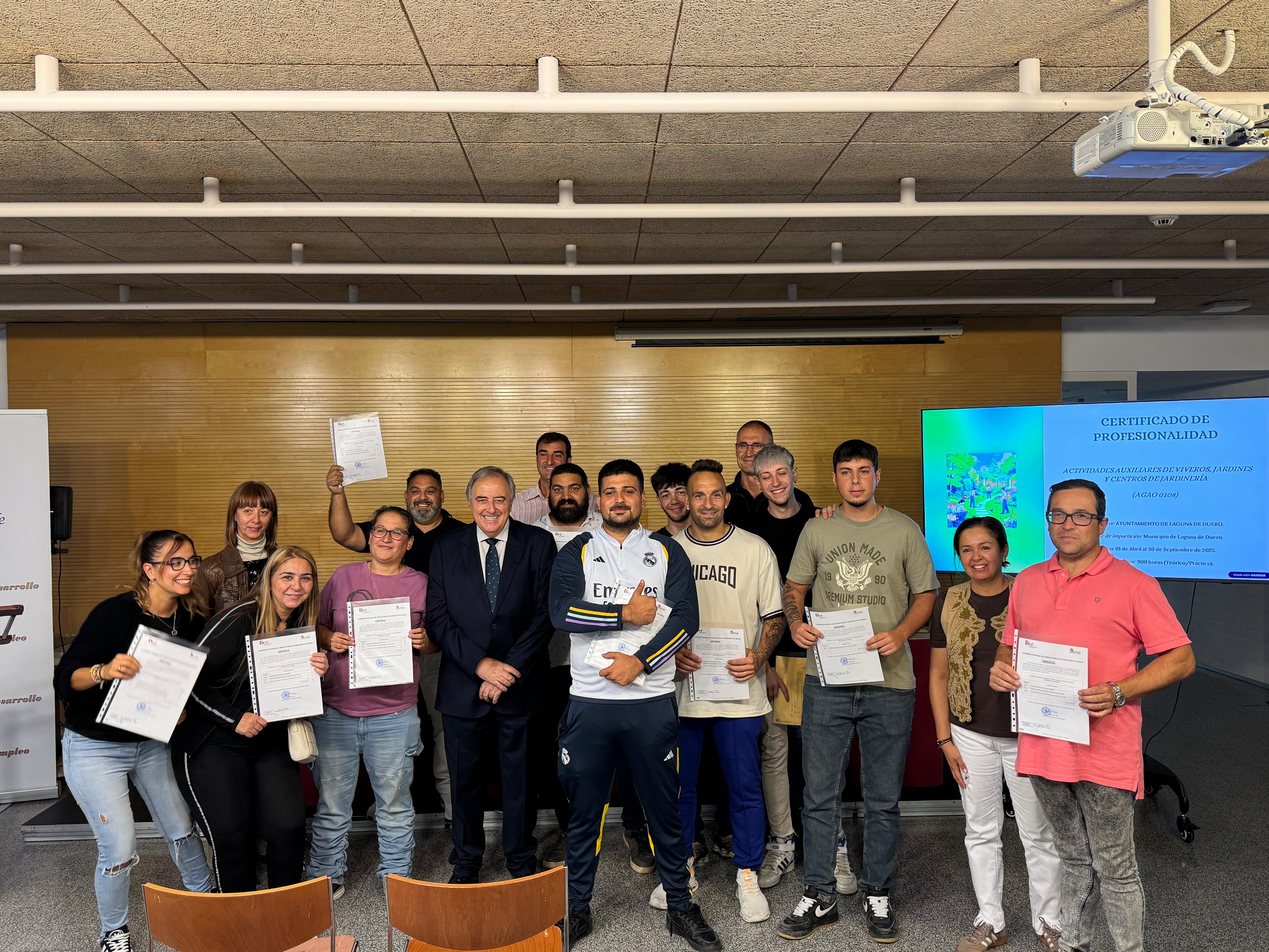 Tras 6 meses de formación teórica y práctica para los 12 alumnos de cada uno de los programas, hoy llegan a su fin los Programas Mixtos de Formación y Empleo de este año 2025 correspondientes a “Zonas Verdes” y “Limpieza de espacios municipales y espacios abiertos”. Es por ello que la Concejalía de Desarrollo Local del Ayuntamiento de Laguna de Duero les ha entregado sus correspondientes diplomas acreditativos, con la presencia del alcalde, Avelino Álvarez, y el edil del que dependen, Fernando Vara.