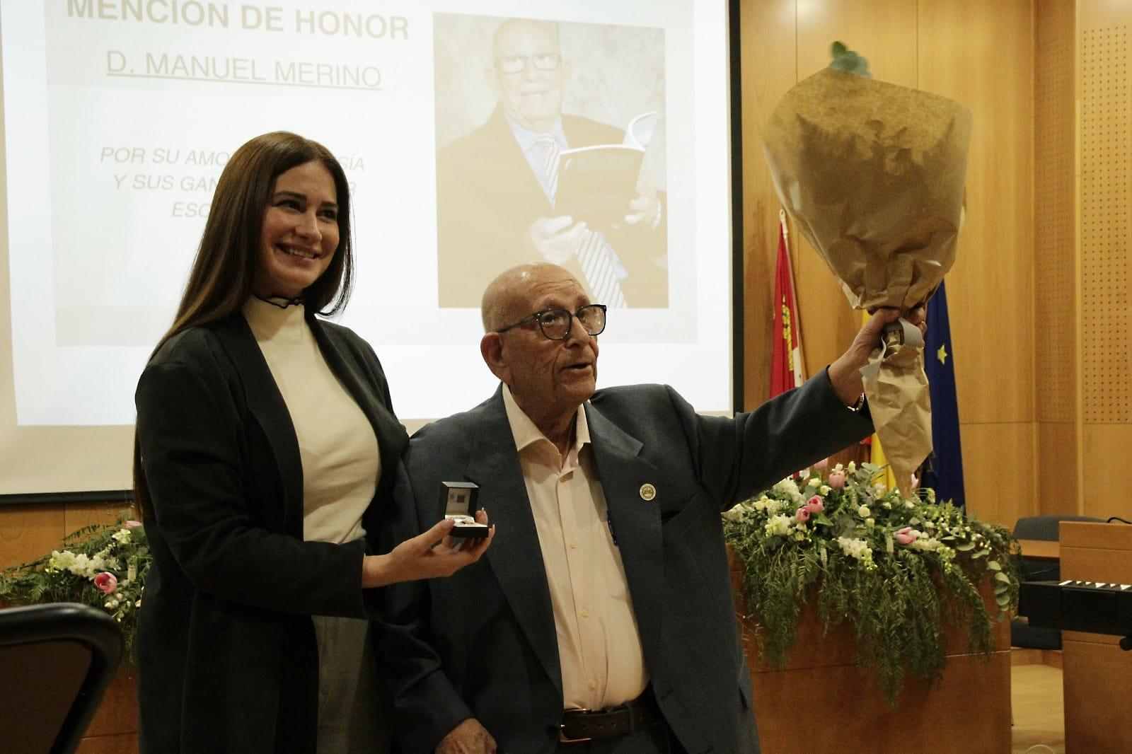 Uno de los momentos más emotivos fue el de la entrega de una Mención Especial por primera vez desde que comenzó a celebrarse esta cita y por decisión del jurado a Manuel Merino por toda una vida dedicada a la poesía, quien sigue escribiendo y presentándose al certamen con 96 años. Le entregó el reconocimiento la diputada de Cultura.