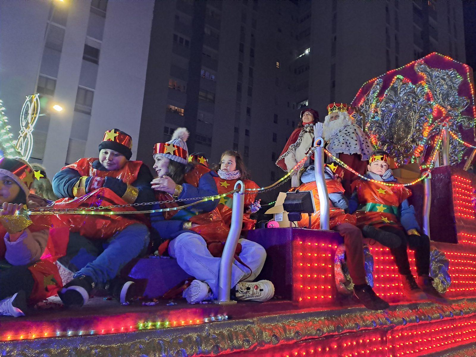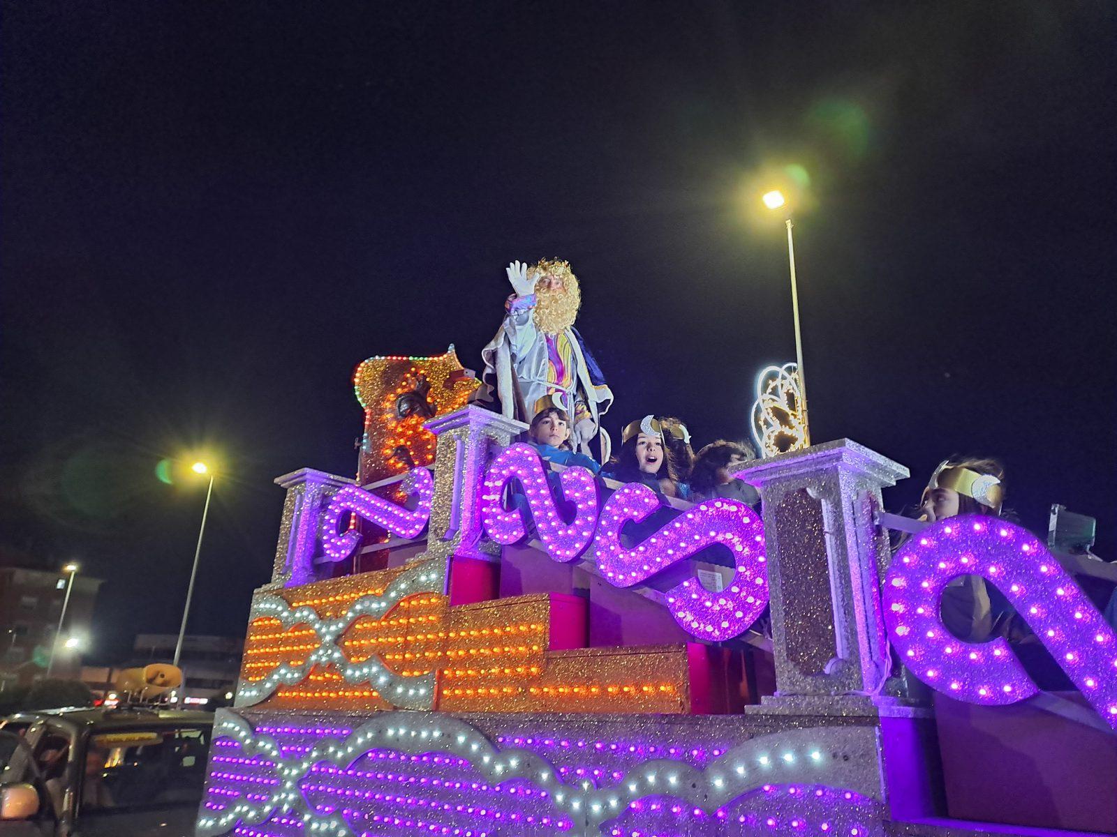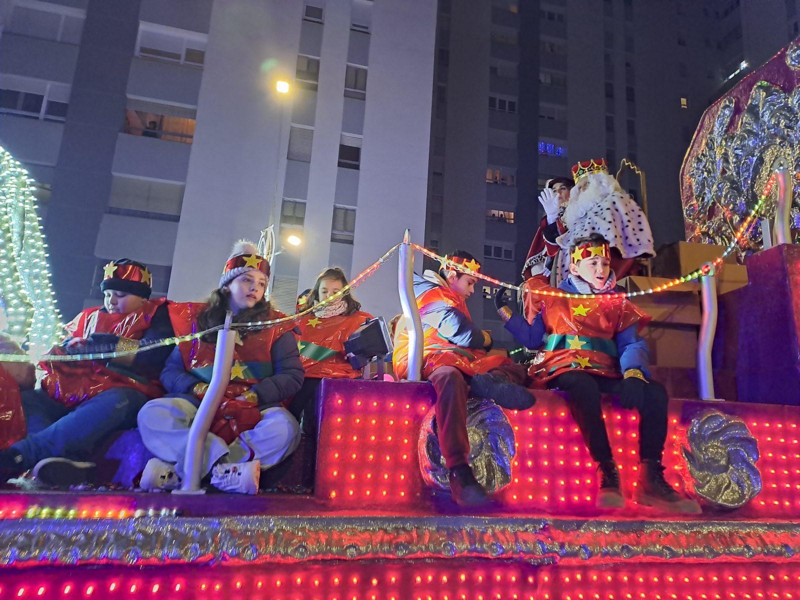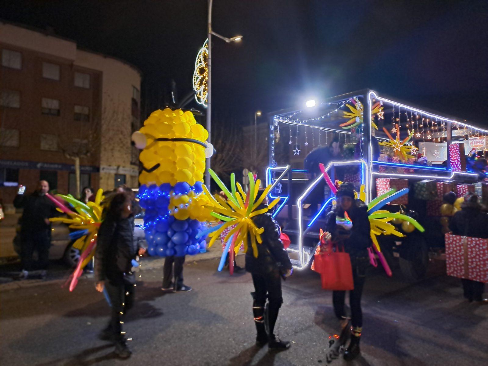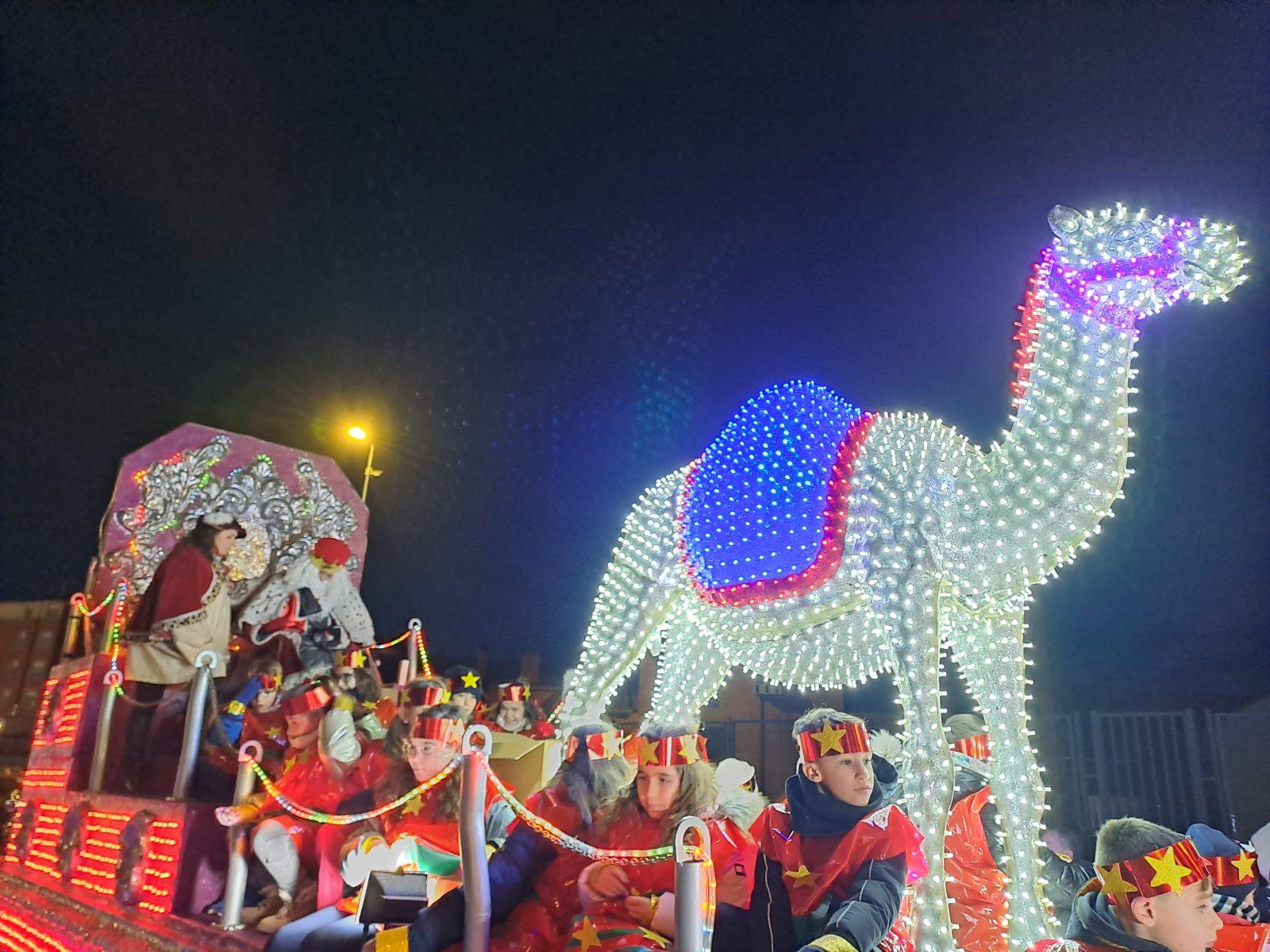 Pasaban algunos minutos de las siete de la tarde cuando SS.MM. los Reyes Magos de Oriente salían, entre la sorpresa de algunos niños, de La Casa de las Artes para dirigirse cada uno a su carroza. Además de ellos, lo hacían los 75 niños y niñas de la localidad que les han acompañado en su recorrido arrojando cerca de dos toneladas de caramelos sin gluten, 25 con cada rey mago. Además de las tres carrozas de sus majestades, antes de éstas, encabezaba una que representaba al conocido Belén Viviente de la localidad, con personajes del mismo y otra cargada de regalos que corría a cargo de la Peña La Resistencia. Antes de todo el cortejo una alegre batucada abría paso y anunciaba la llegada de tan esperado momento. Entre carroza y carroza variadas animaciones a cargo de la Asociación de Peñas y de voluntarios del pueblo, circenses a cargo de la compañía El Estaribel, figuras fantásticas y personajes gigantes elaborados con globos, todo organizado desde la Concejalía de Fiestas con Estela Crespo a la cabeza.