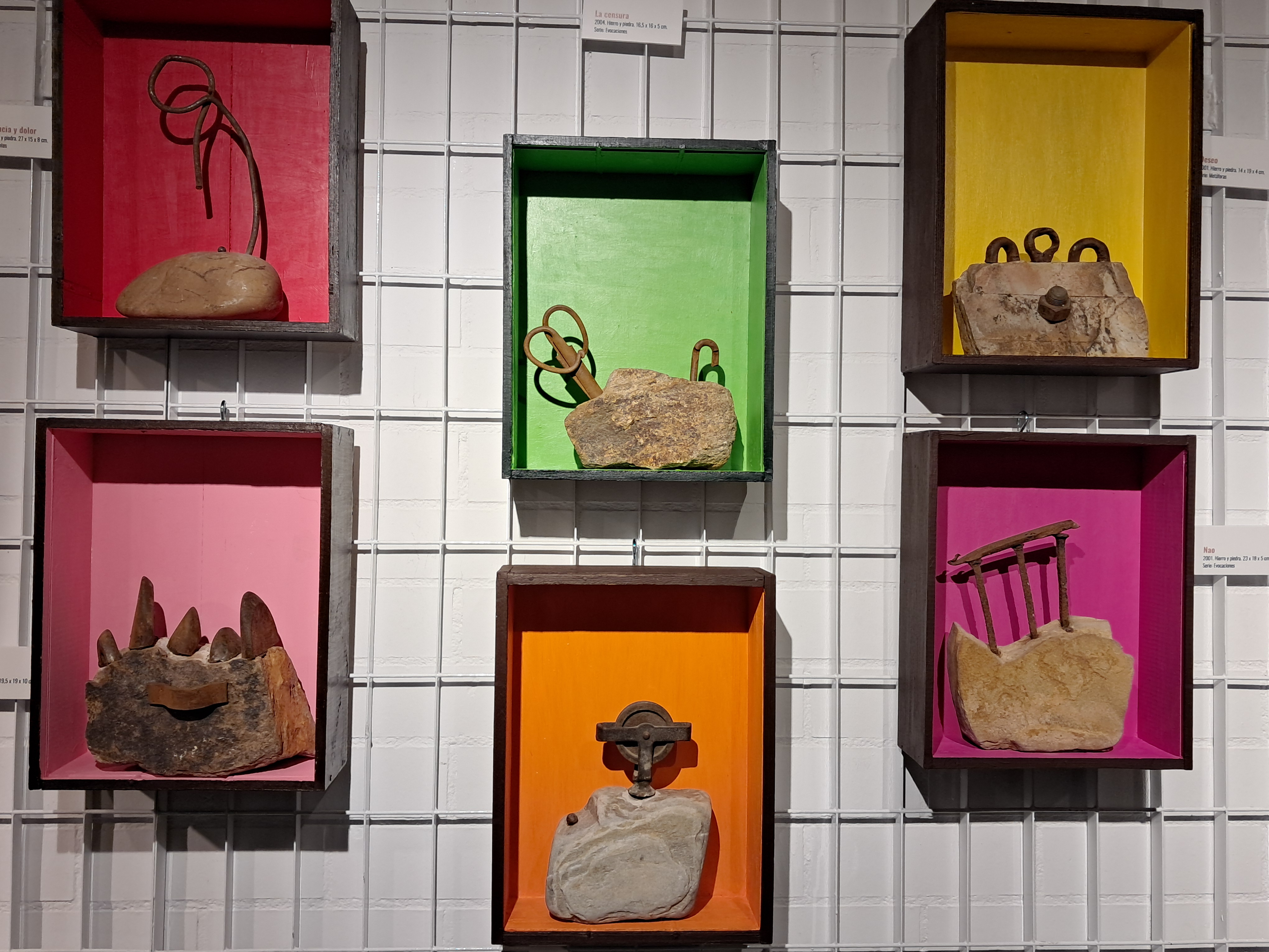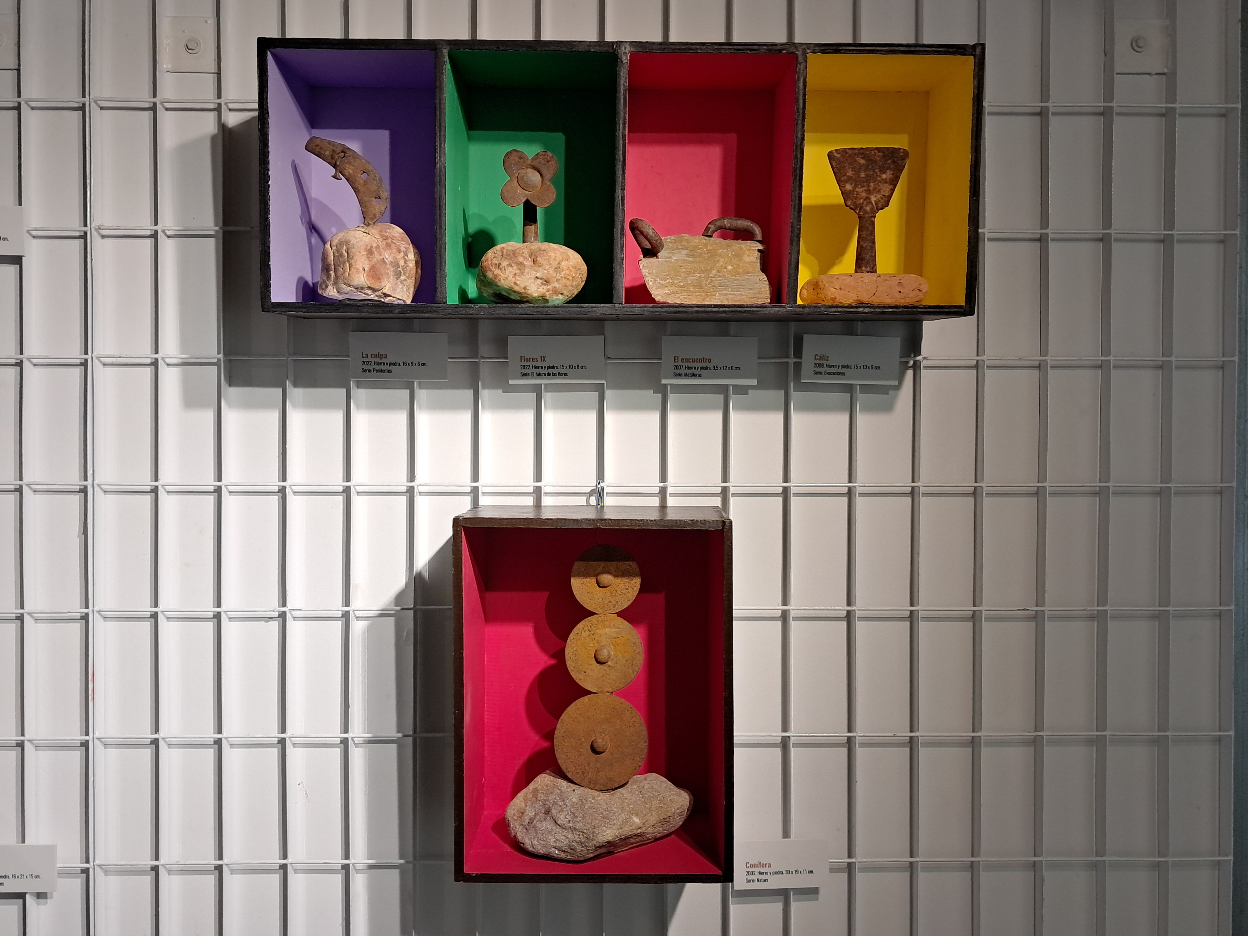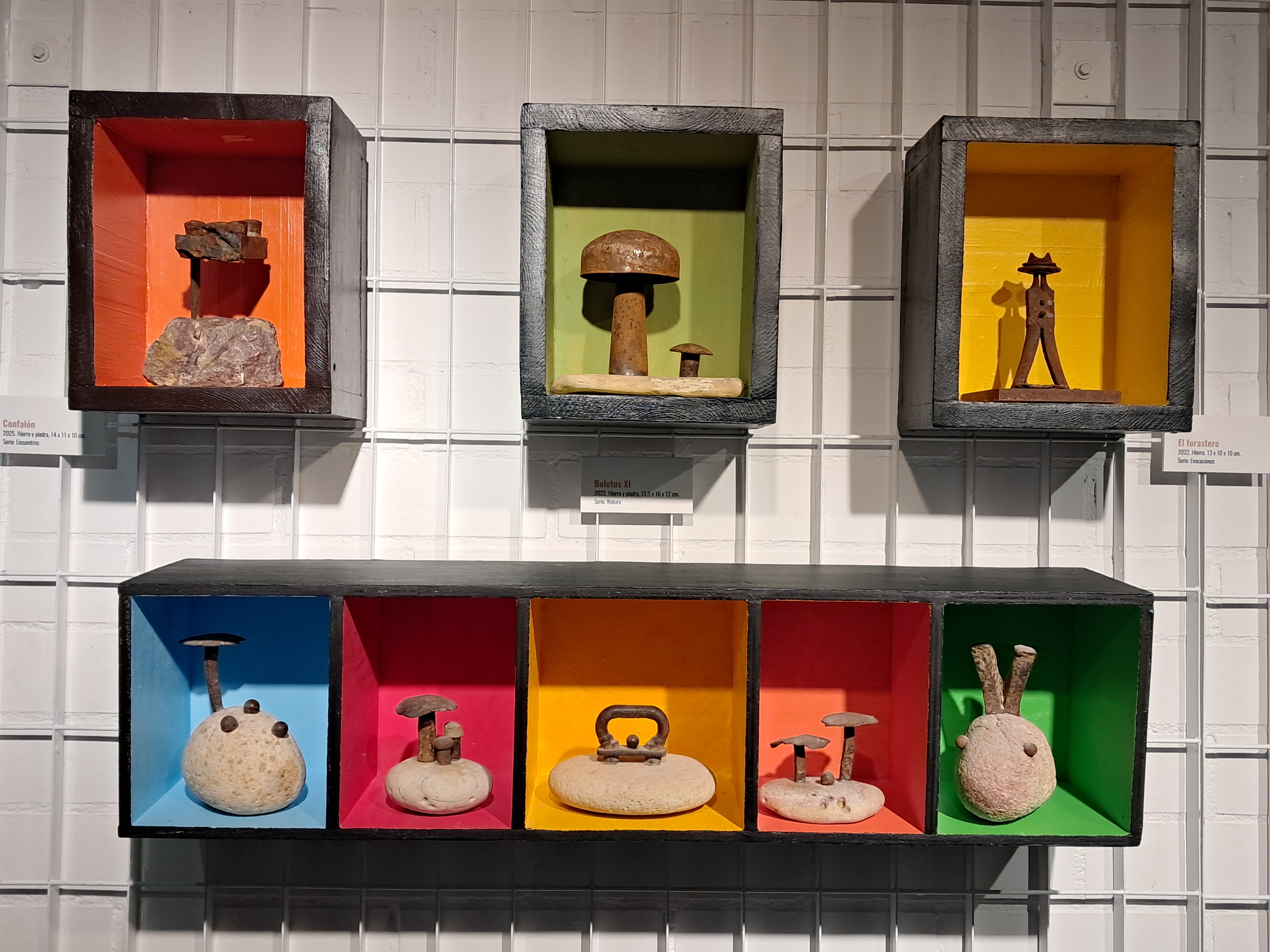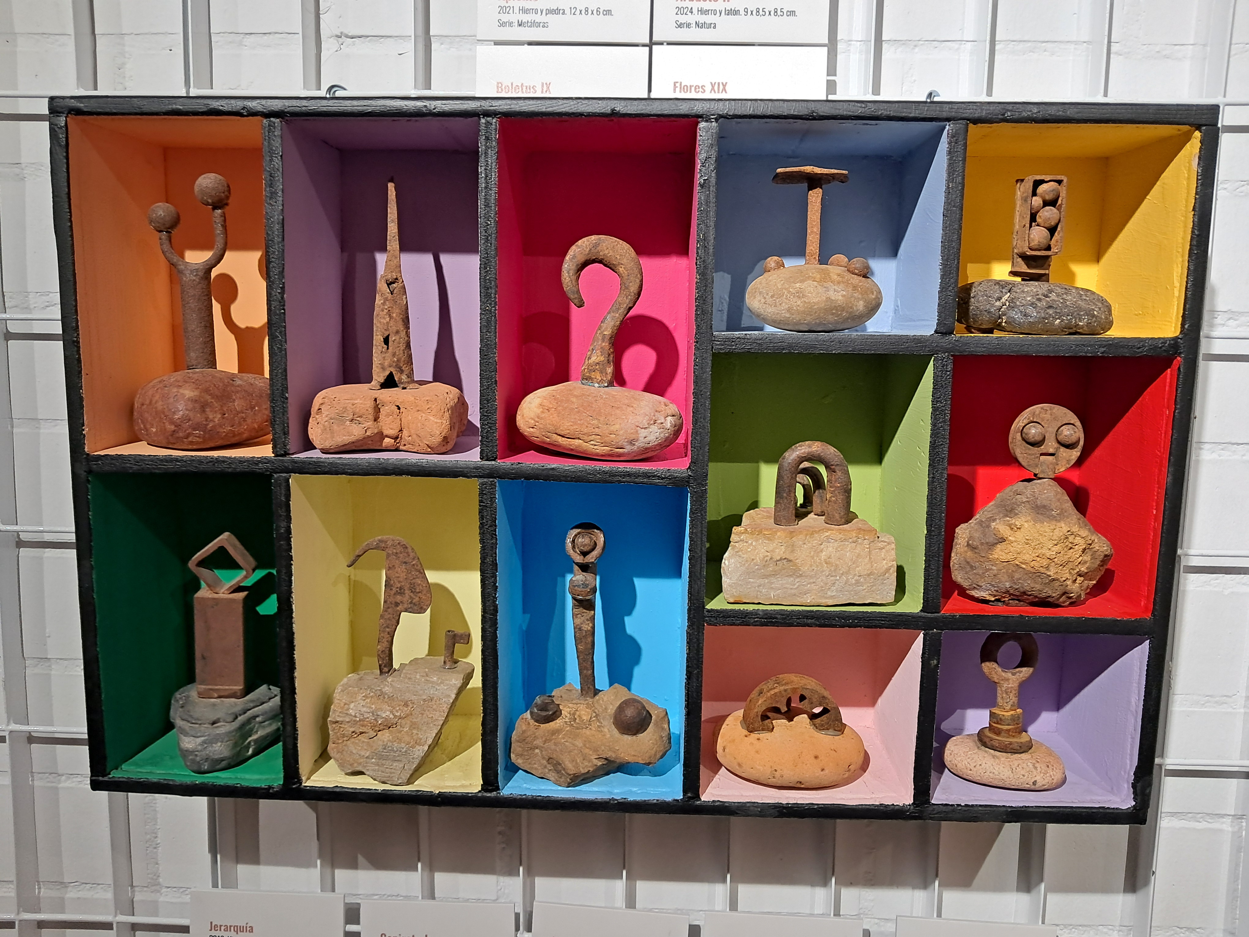 Hierros y piedras son los materiales con los que están realizadas todas estas creaciones a las que el autor llama “ferrolitos”. Los hierros se muestran viejos y ajados, con vestigios de sus formas originarias a modo de recuerdo de la función para la que fueron imaginados y que ahora, con el paso del tiempo, se han convertido en una suerte de representaciones con las huellas visibles de la memoria de toda una vida de usos y abusos. Así se manifiesta en la materialidad y textura de estas composiciones.