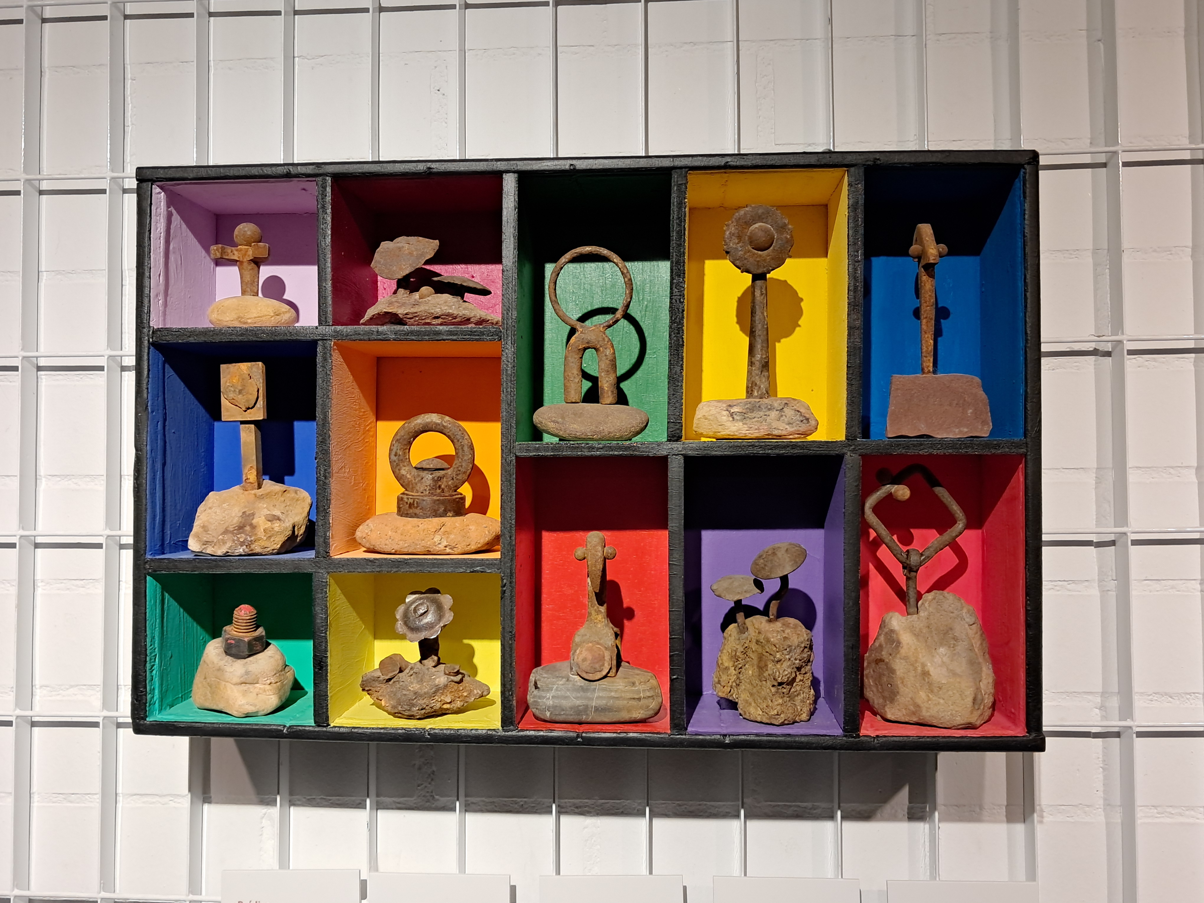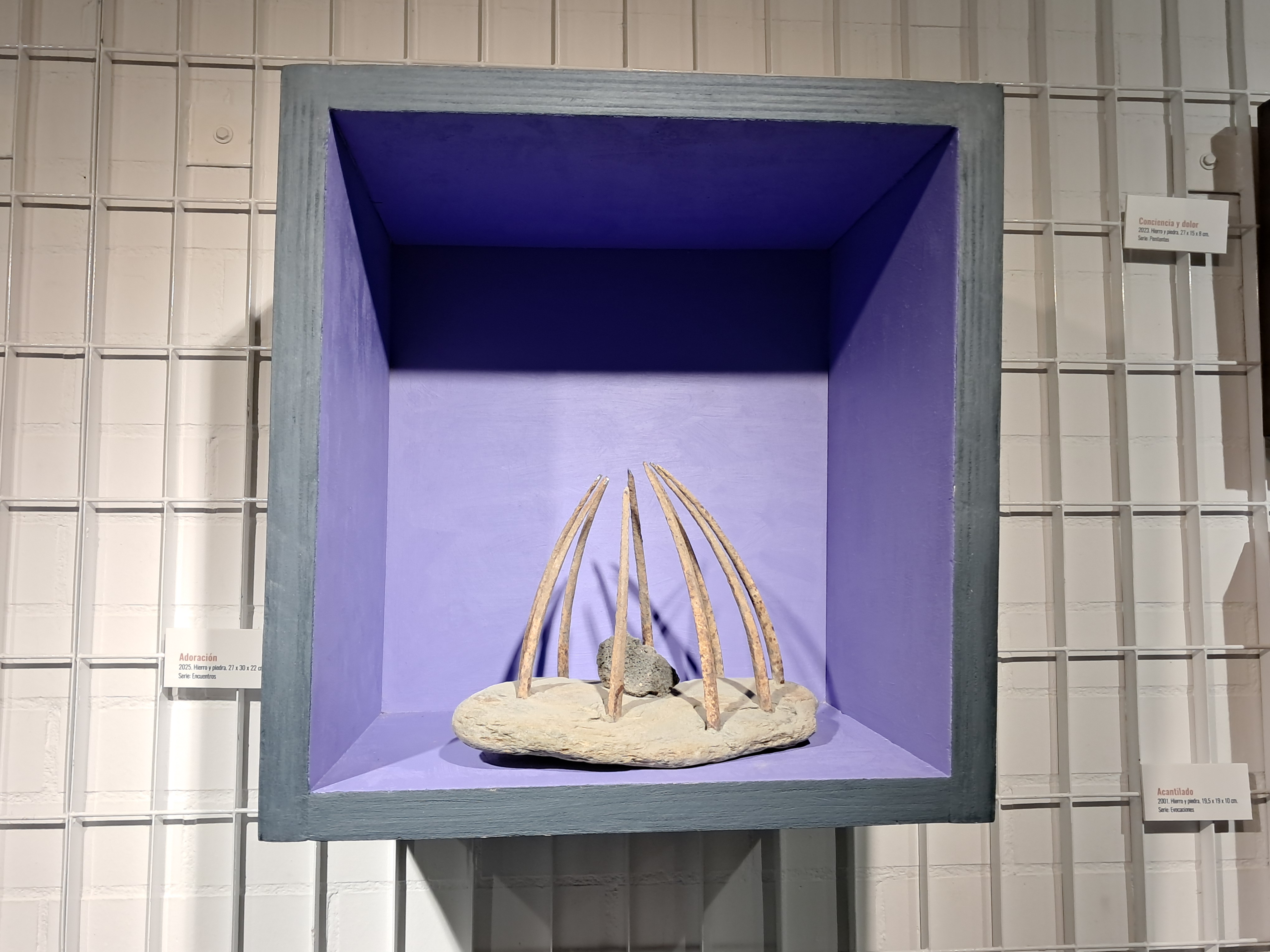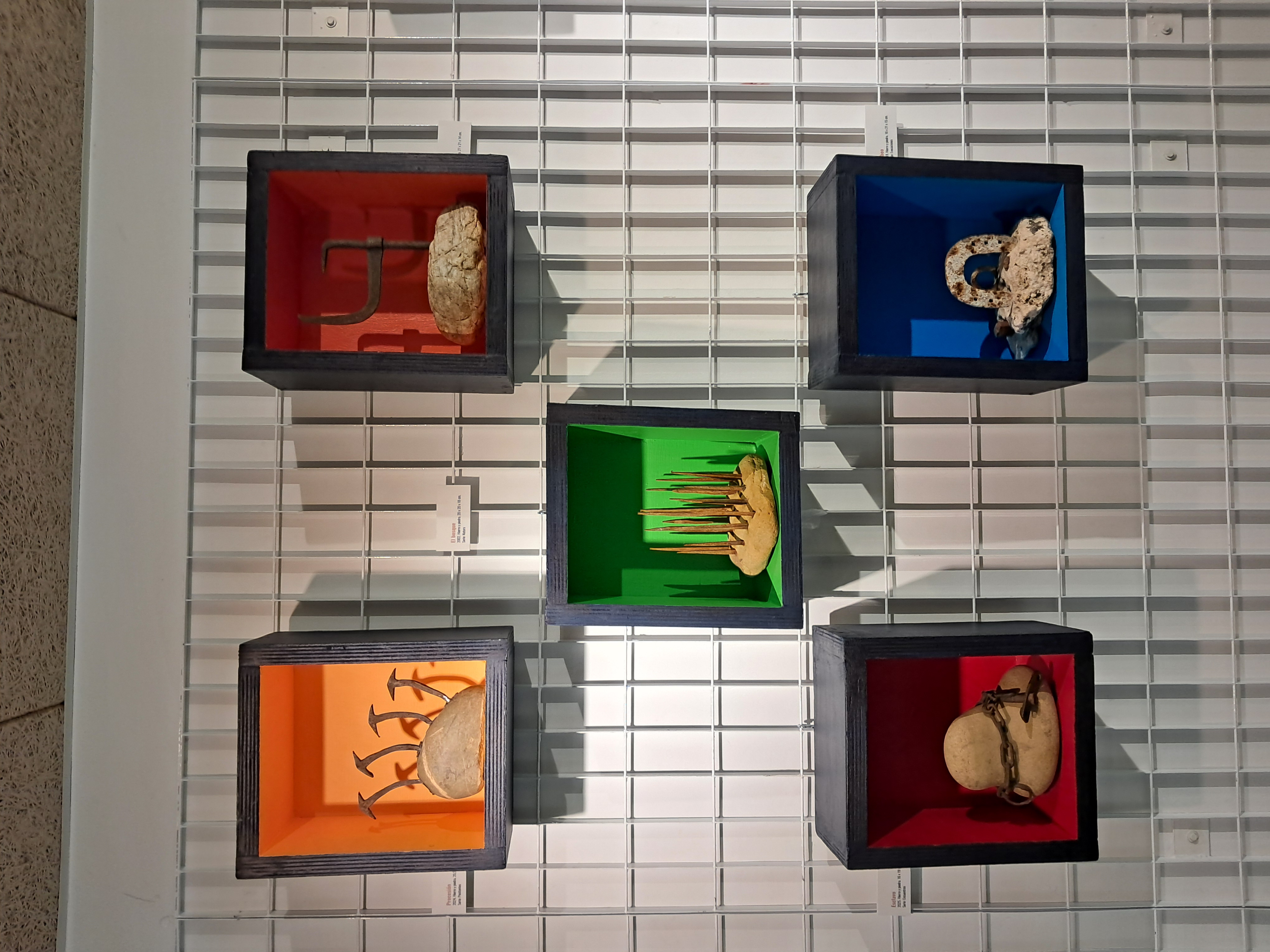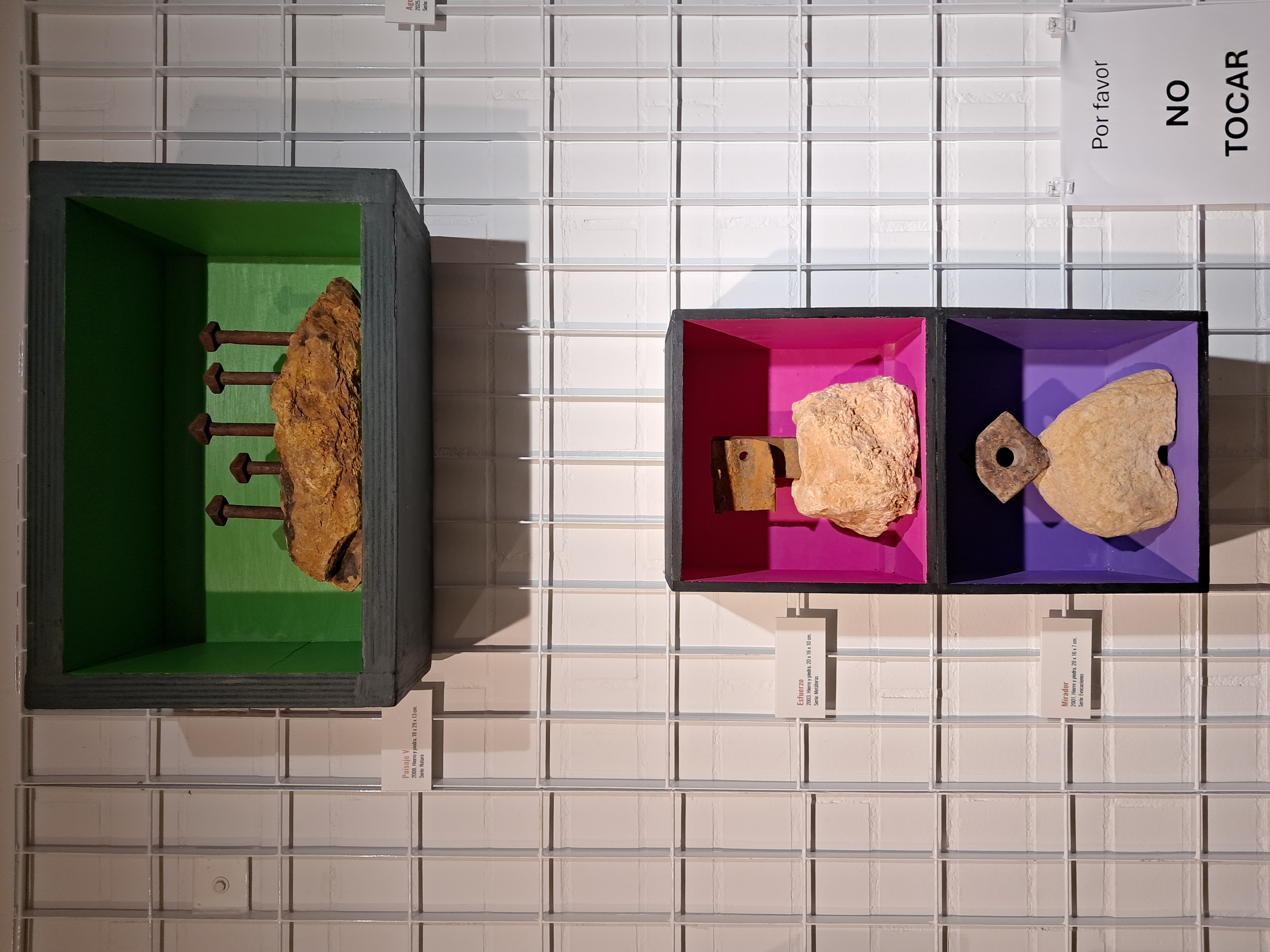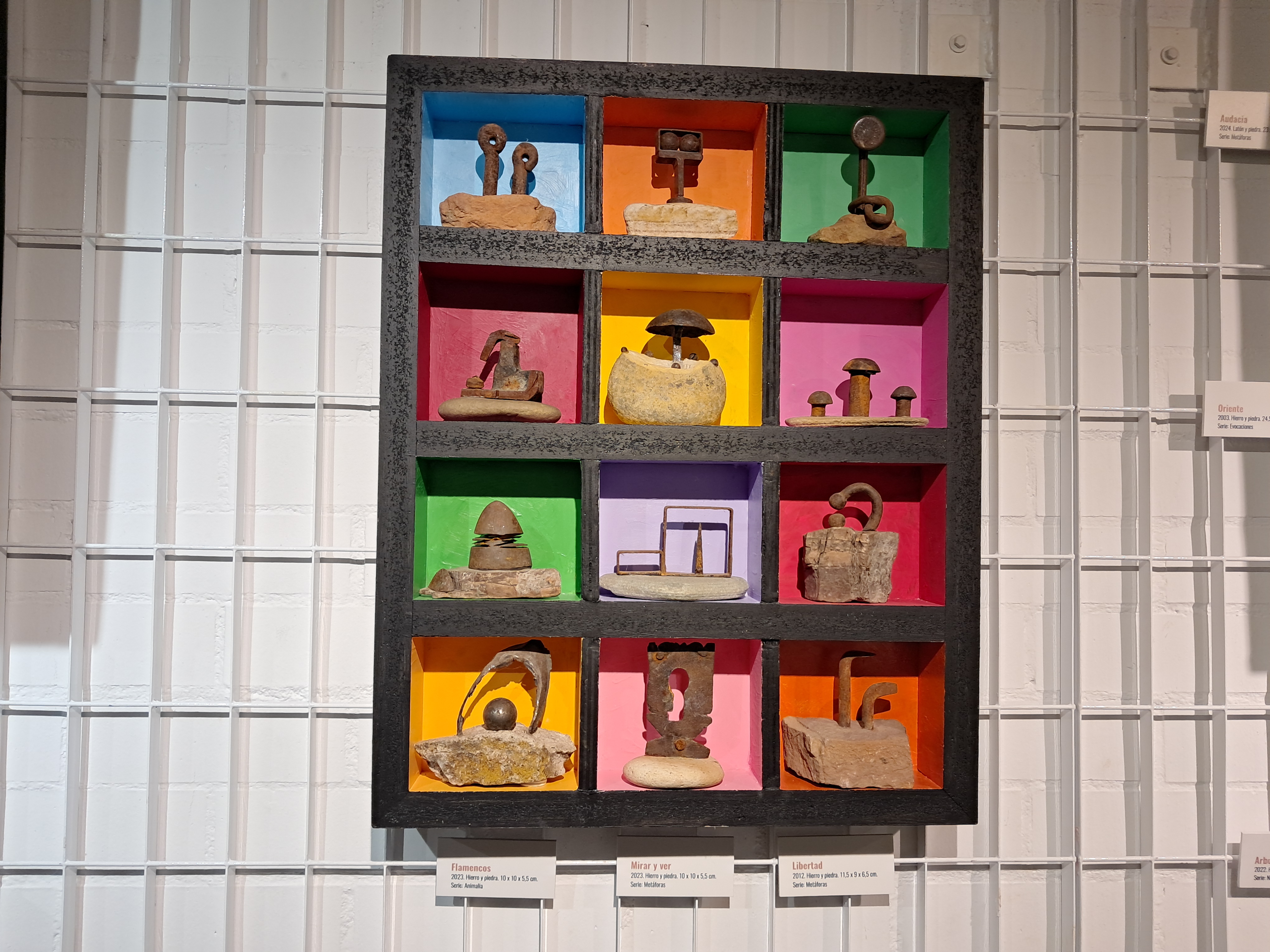 Hierros y piedras son los materiales con los que están realizadas todas estas creaciones a las que el autor llama “ferrolitos”. Los hierros se muestran viejos y ajados, con vestigios de sus formas originarias a modo de recuerdo de la función para la que fueron imaginados y que ahora, con el paso del tiempo, se han convertido en una suerte de representaciones con las huellas visibles de la memoria de toda una vida de usos y abusos. Así se manifiesta en la materialidad y textura de estas composiciones.
