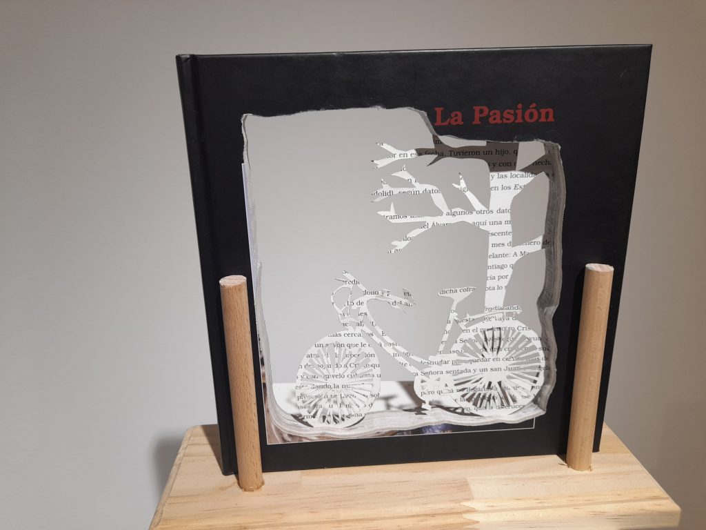 Su pasión por el plegado tomo rumbo y comenzó a comprar libros de los maestros del origami (Akira Yoshizawa, Manuel Sirgo o Eric Joisel, hasta tener unos cuarenta. El autor ha desarrollado varios tipos de objetos: pendientes, pendientes de clavo, colgantes, broches, alfileres; pero también móviles, marcapáginas o cuadros.”Las posibilidades del papel son infinitas y pensé que ceñirme tan sólo al plegado no me permitía expresarlas en su totalidad”. Aparte de doblar Juan Ángel también se dedica a recortar el papel con un bisturí y la ayuda de una lupa para crear escenas que plasma en cuadros, cajas o en botellas (desde 13cm hasta 2cm), en la exposición de Siluetas y Plegados, encontraremos más de 30 cuadros realizados bajo ésta técnica.”Es una muestra muy curiosa y exclusiva, invito a todos los vecinos y vecinas a que la visiten, la cultura abarca infinidad de formas y aquí se ve representado claramente” añade Lucía Castro, concejal de Cultura.