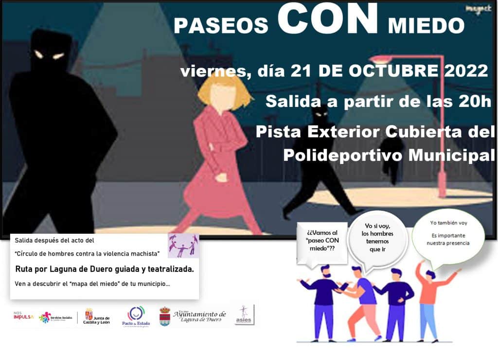 - El próximo viernes día 21 de octubre, a partir de las 20:00h, en la Pista exterior cubierta del Polideportivo, tendrá lugar la celebración del Círculo Hombres conta la Violencia Machista y a continuación la salida del recorrido del Mapa del Miedo de Laguna de Duero.