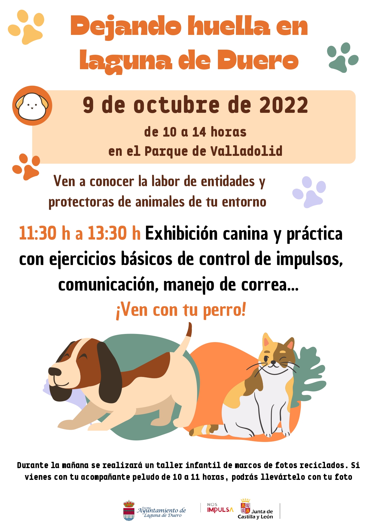 Durante toda la jornada del domingo 9 de octubre, desde las 10:00 de la mañana, se podrá disfrutar en el parque Valladolid, de un taller de marcos de fotos reciclables según el orden de llegada, mercadillos solidarios y puestos de información de las diferentes protectoras participantes. “Lo que buscamos es que la gente disfrute con su perrito o gatito ese día, pedir también que sean por favor responsables si saben que tienen un perro que no es muy sociable, que pongan todo de su parte para evitar problemas, que ya sabemos como es esto, y que disfruten de este día con ellos porque se lo merecen “afirmó la concejal Paula Carriba.