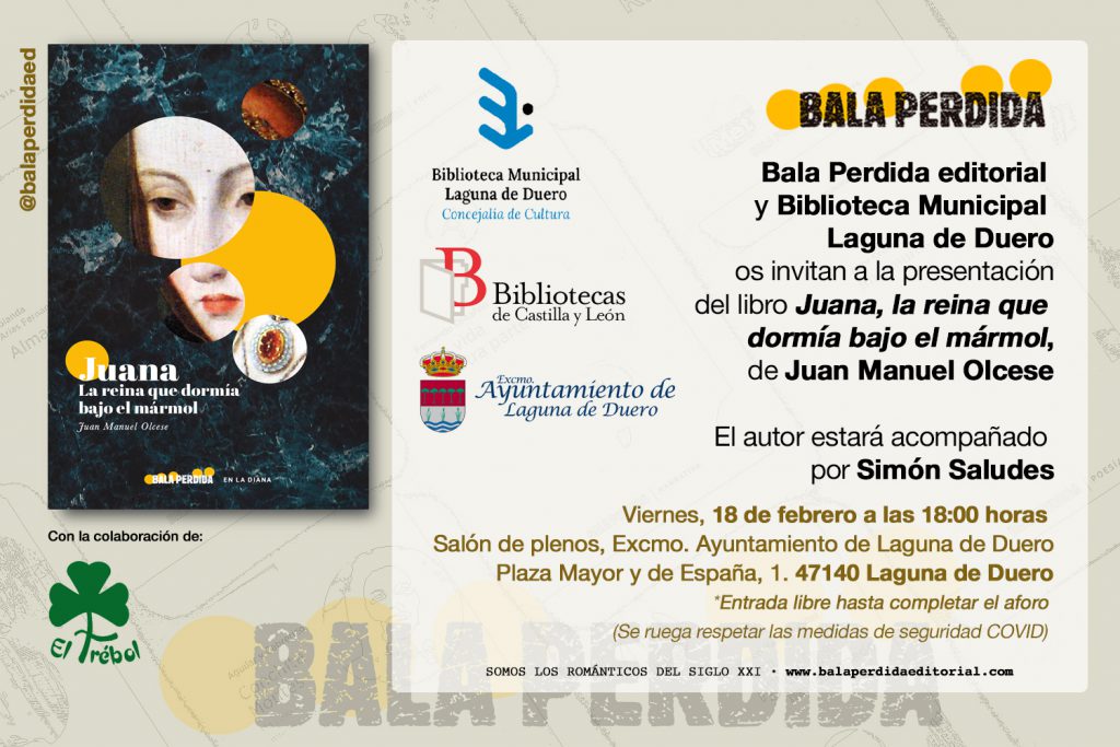 Bala Pérdida y Bibliioteca de Laguna de Duero invitan al público a la presentación bajo todas las medidas obligatorias contra el Covid-19. La muestra se realizará en el Salón de Plenos del Excmo Ayuntamiento de Laguna de Duero el viernes 18 de febrero a las 18:00h.