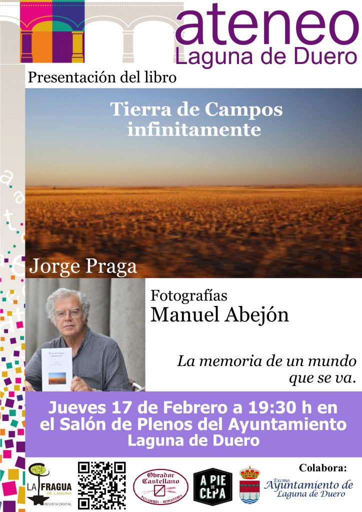 El Ayuntamiento de Laguna de Duero acoge la presentación, el próximo día 17 de febrero a las 19:30 en el Salón de Plenos, del libro del profesor Jorge Praga “Tierra de Campos Infinitamente” junto con la proyección de fotografías de Manuel Abejón.