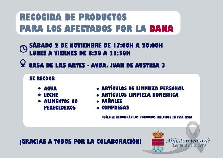 Con el fin de ayudar a los afectados por la Dana que ha azotado diferentes municipios, sobre todo de la Comunidad Valenciana, el Ayuntamiento de Laguna de Duero abre un punto de recogida de productos para enviar a las zonas afectadas.
