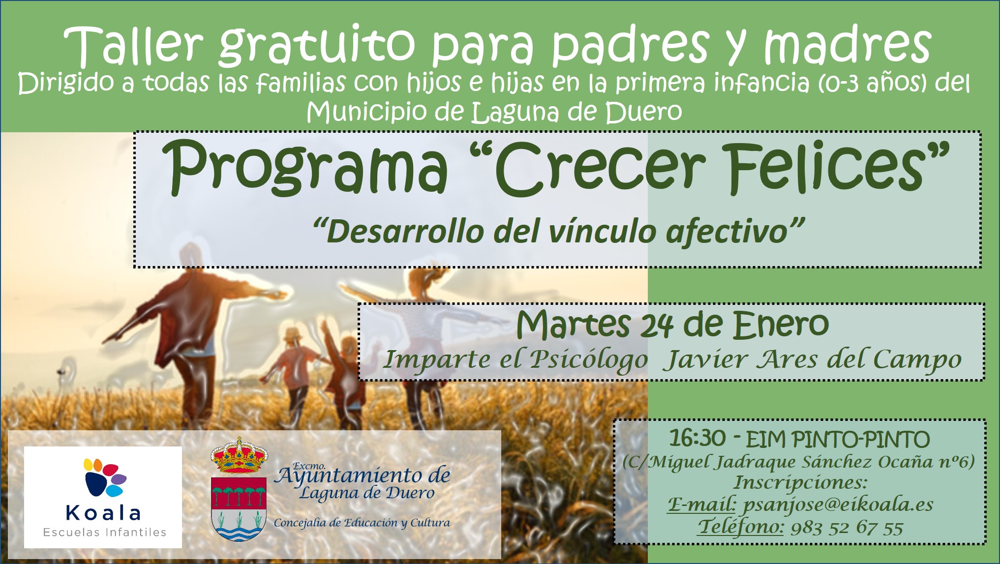 El Ayuntamiento de Laguna de Duero, desde la Concejalía de Educación, a través de la EIM Pinto Pinto y Koala, ofrece el segundo taller perteneciente al programa “CRECER FELICES” en modalidad presencial y dentro del Plan de Acciones Abiertas dirigidas a familias del municipio con hijos e hijas en la primera infancia (0-3 años), que se realizará en la EIM Pinto Pinto: “Desarrollo del Vínculo Afectivo” a cargo de psicólogo JAVIER ARES DEL CAMPO.