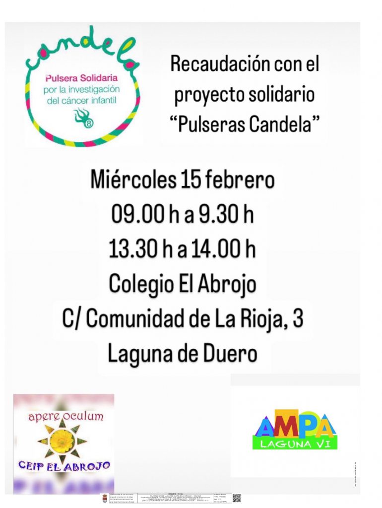 - El próximo miércoles 15 de febrero y con motivo del día internacional del cáncer infantil, desde el CEIP EL ABROJO y en colaboración con el AMPA Laguna VI, se podrán conseguir estas pulseras a cambio de un donativo voluntario que será remitido a la asociación Pulseras Candela.