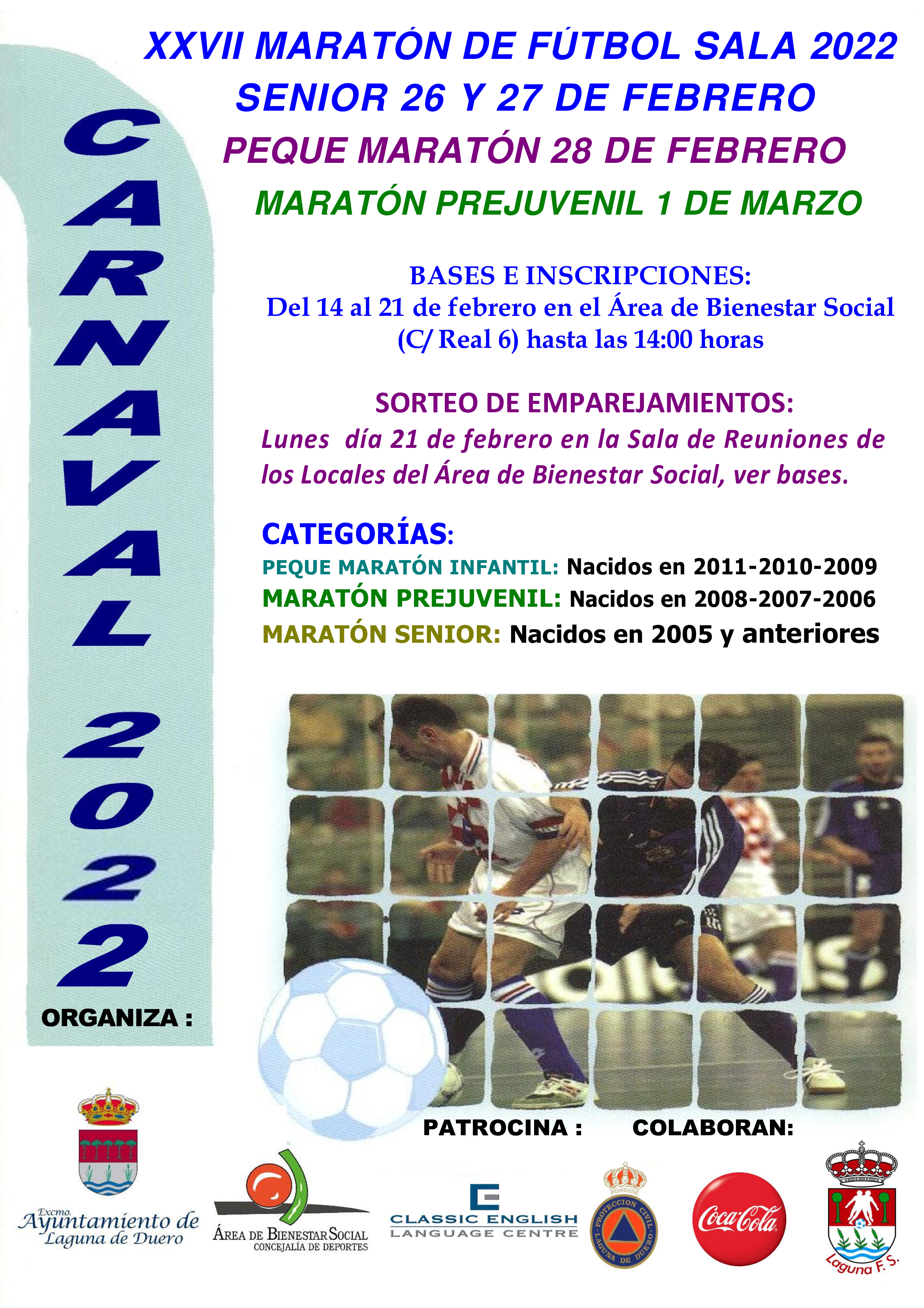 El Ayuntamiento de Laguna de Duero desde la concejalía de Deportes organiza el XXVII Maratón de Futbol Sala 2022 .Laguna de Duero volverá un año más a vivir su cita más especial con el deporte en Carnavales. La vigésimo séptima edición del torneo se celebrara los días 26, 27, 28 de febrero y 1 de marzo en el polideportivo municipal y en el polideportivo La Nava.
