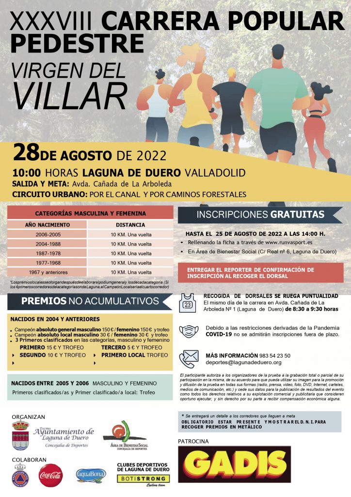 El Ayuntamiento de Laguna de Duero desde la Concejalía de Deportes, organiza la XXXVIII Popular Pedestre Virgen del Villar 2022, la cita anual se celebrará el próximo domingo 28 de agosto.